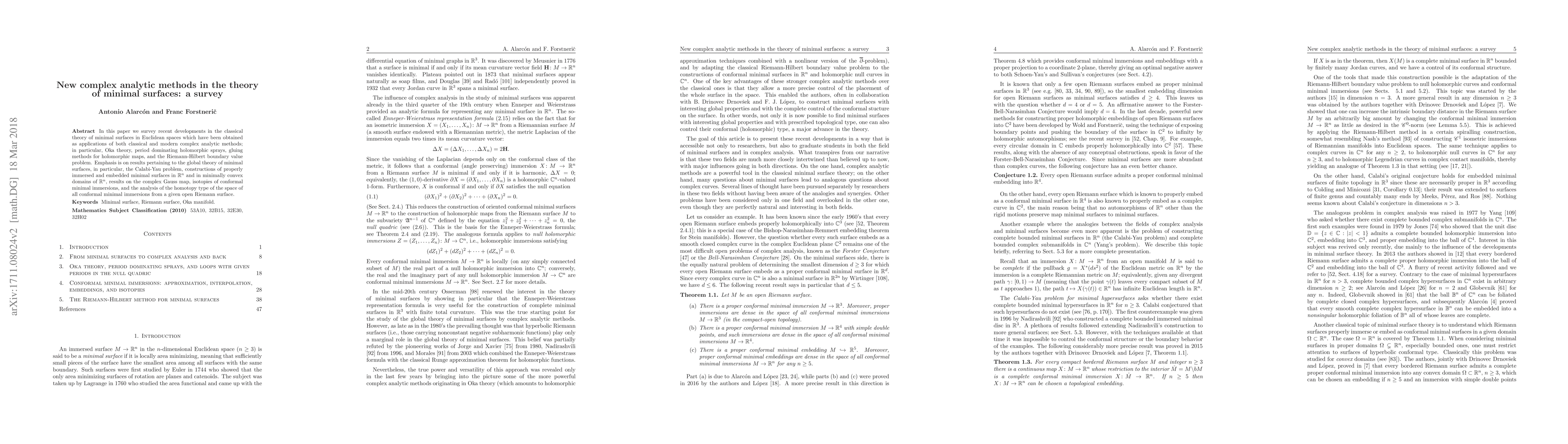 This paper surveys recent advancements in minimal surface theory using complex analytic methods, focusing on global results, the Calabi-Yau problem, and constructions of minimal surfaces in various domains, employing techniques like Oka theory and the Riemann-Hilbert boundary value problem.