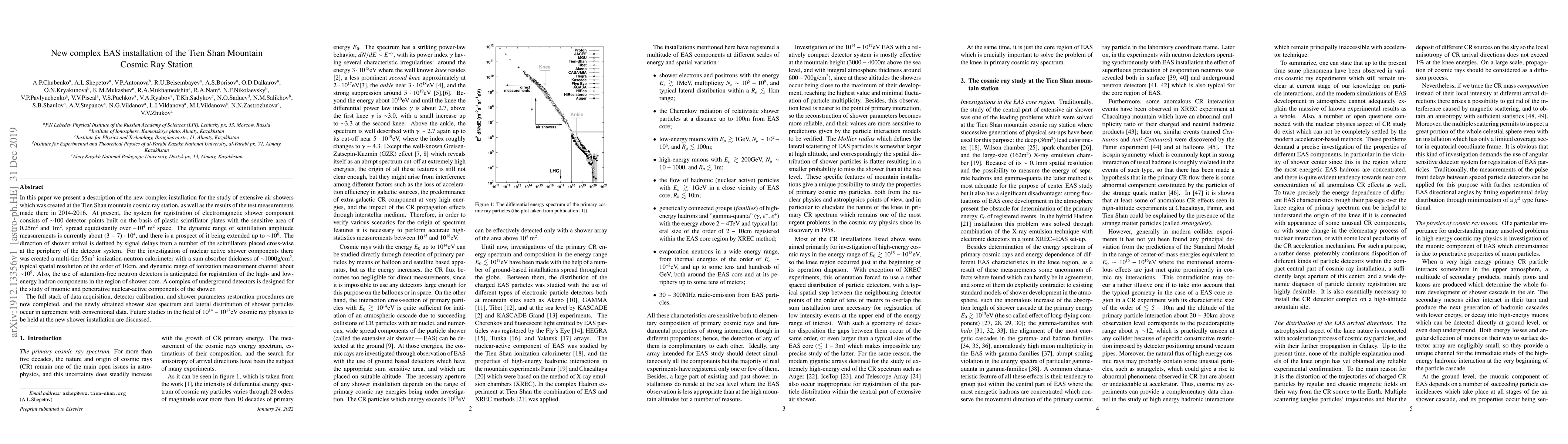 We present a description of the new complex installation for the study of extensive air showers which was created at the Tien Shan mountain cosmic ray station, as well as the results of the test measurements made there in 2014-2016. At present, the system for registration of electromagnetic shower component consists of $\sim$100 detector points built on the basis of plastic scintillator plates with the sensitive area of 0.25m$^2$ and 1m$^2$, spread equidistantly over $\sim$10$^4$m$^2$ space. The dynamic range of scintillation amplitude measurements is currently about $(3-7)\cdot 10^4$, and there is a prospect of it being extended up to $\sim$10$^6$. The direction of shower arrival is defined by signal delays from a number of the scintillators placed cross-wise at the periphery of the detector system. For the investigation of nuclear active shower components there was created a multi-tier 55m$^2$ ionization-neutron calorimeter with a sum absorber thickness of $\sim$1000g/cm$^2$, typical spatial resolution of the order of 10cm, and dynamic range of ionization measurement channel about $\sim$10$^5$. Also, the use of saturation-free neutron detectors is anticipated for registration of the high- and low-energy hadron components in the region of shower core. A complex of underground detectors is designed for the study of muonic and penetrative nuclear-active components of the shower. The full stack of data acquisition, detector calibration, and shower parameters restoration procedures are now completed, and the newly obtained shower size spectrum and lateral distribution of shower particles occur in agreement with conventional data. Future studies in the field of $10^{14}-10^{17}$eV cosmic ray physics to be held at the new shower installation are discussed.
