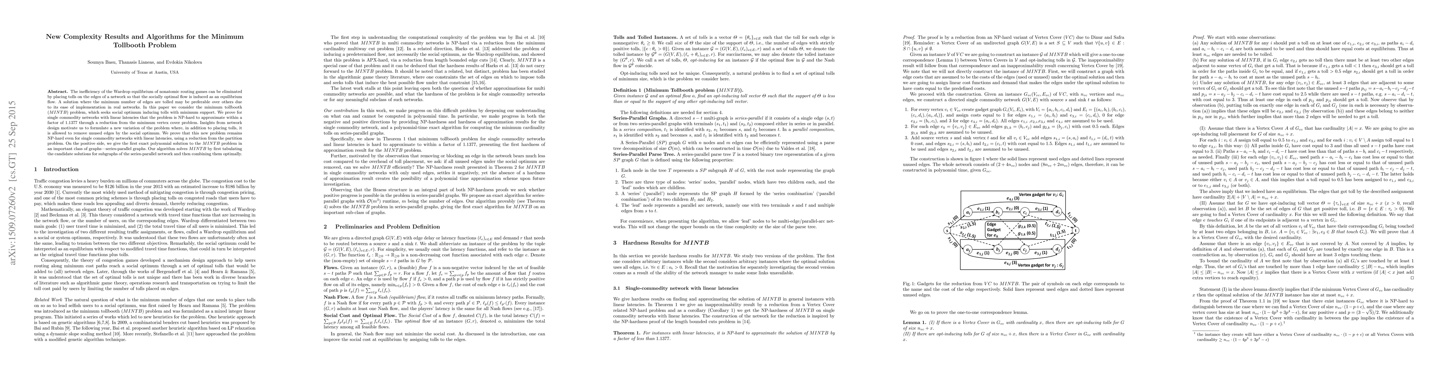 The inefficiency of the Wardrop equilibrium of nonatomic routing games can be eliminated by placing tolls on the edges of a network so that the socially optimal flow is induced as an equilibrium flow. A solution where the minimum number of edges are tolled may be preferable over others due to its ease of implementation in real networks. In this paper we consider the minimum tollbooth (MINTB) problem, which seeks social optimum inducing tolls with minimum support. We prove for single commodity networks with linear latencies that the problem is NP-hard to approximate within a factor of $1.1377$ through a reduction from the minimum vertex cover problem. Insights from network design motivate us to formulate a new variation of the problem where, in addition to placing tolls, it is allowed to remove unused edges by the social optimum. We prove that this new problem remains NP-hard even for single commodity networks with linear latencies, using a reduction from the partition problem. On the positive side, we give the first exact polynomial solution to the MINTB problem in an important class of graphs---series-parallel graphs. Our algorithm solves MINTB by first tabulating the candidate solutions for subgraphs of the series-parallel network and then combining them optimally.