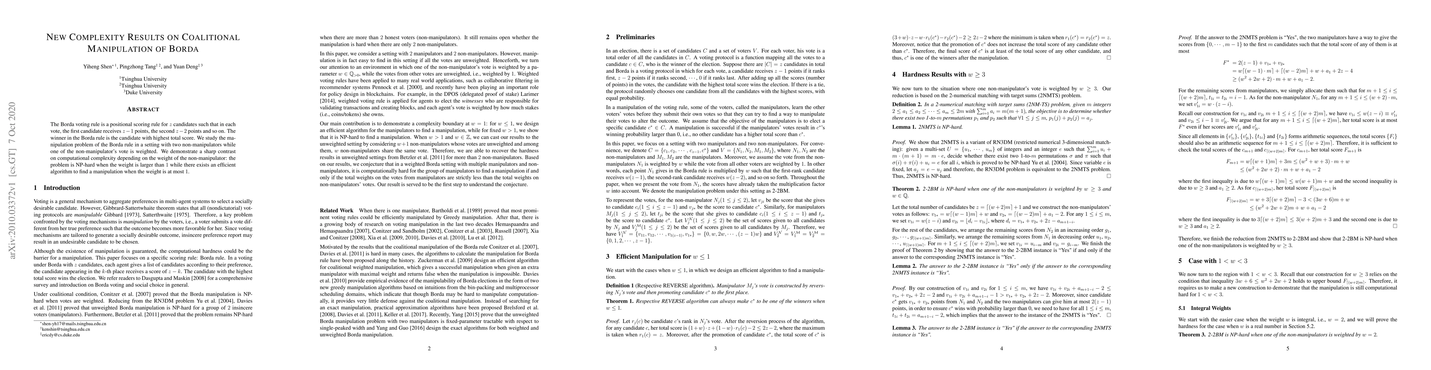 This paper investigates the computational complexity of manipulating the Borda voting rule under different weightings of a non-manipulator's vote. It finds that the manipulation problem is NP-hard when the weight is greater than $1$, but becomes efficiently solvable when the weight is at most $1$.