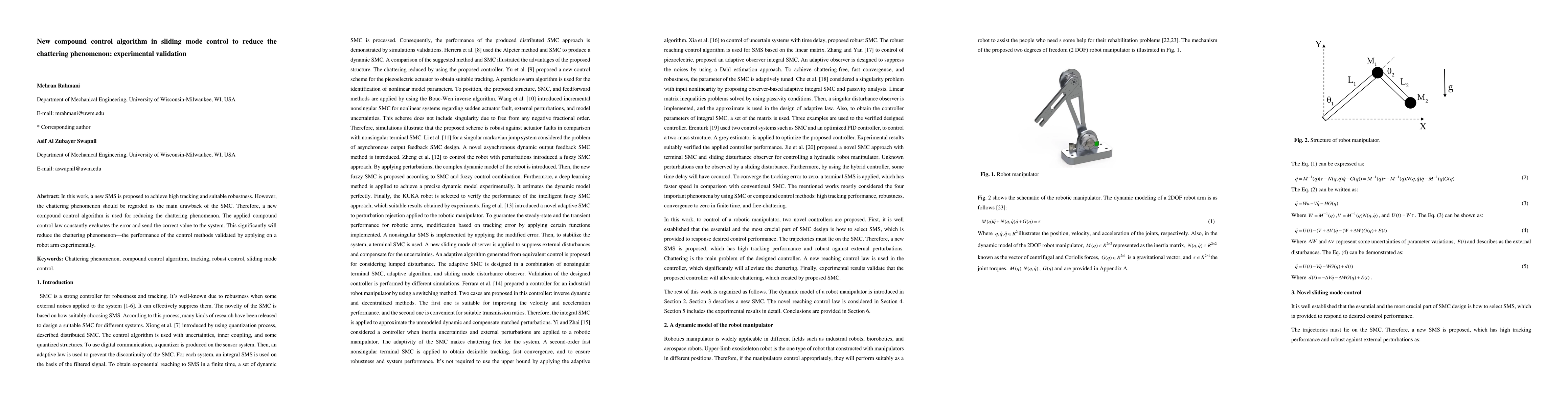 In this work, a new SMS is proposed to achieve high tracking and suitable robustness. However, the chattering phenomenon should be regarded as the main drawback of the SMC. Therefore, a new compound control algorithm is used for reducing the chattering phenomenon. The applied compound control law constantly evaluates the error and send the correct value to the system. This significantly will reduce the chattering phenomenon. The performance of the control methods validated by applying on a robot arm experimentally.