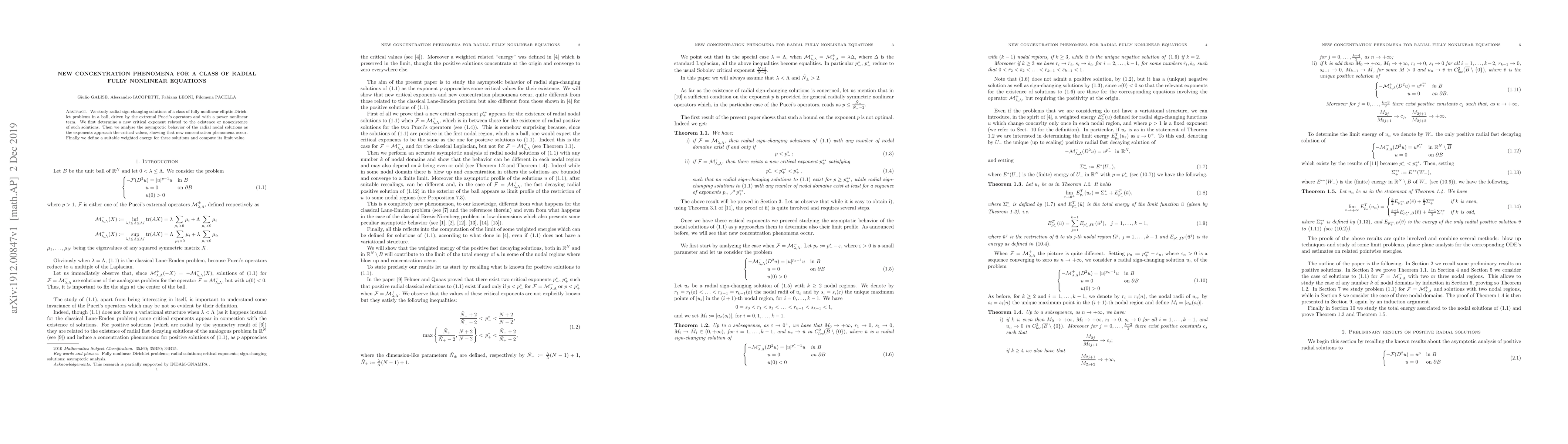 The research identifies a new critical exponent linked to radial sign-changing solutions of specific nonlinear elliptic problems in a ball, governed by Pucci's operators and power nonlinear terms. It reveals new concentration phenomena as exponents near critical values and defines a weighted energy for these solutions, calculating its limiting value.