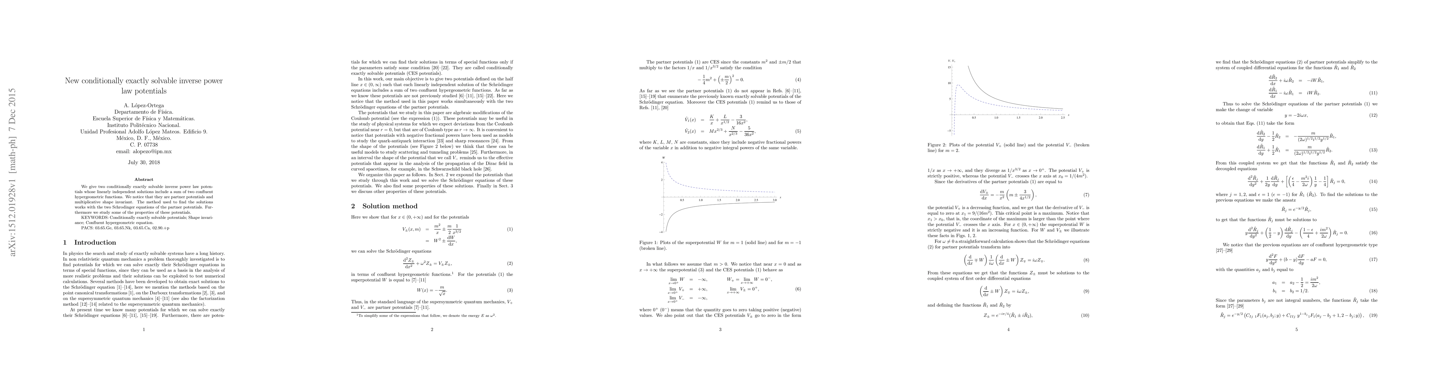 We give two conditionally exactly solvable inverse power law potentials whose linearly independent solutions include a sum of two confluent hypergeometric functions. We notice that they are partner potentials and multiplicative shape invariant. The method used to find the solutions works with the two Schrodinger equations of the partner potentials. Furthermore we study some of the properties of these potentials.