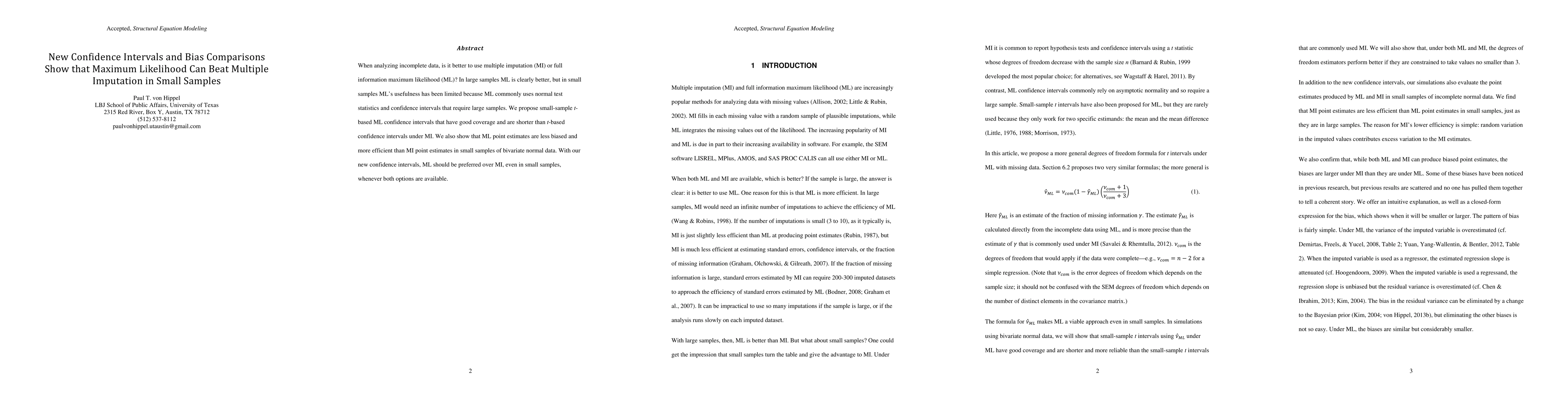 This paper proposes new small-sample t-based confidence intervals for maximum likelihood (ML) estimation, demonstrating that ML is more efficient and less biased than multiple imputation (MI) in small samples. These intervals show better coverage and shorter lengths compared to MI, suggesting that ML should be preferred over MI in small sample settings.