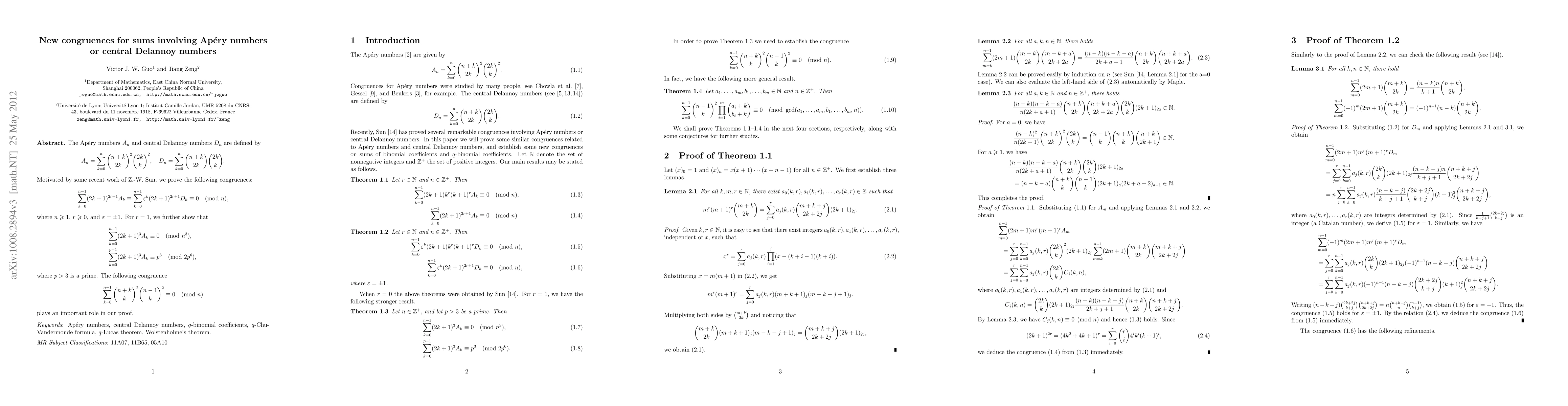 This paper establishes new congruences for sums involving Apéry numbers and central Delannoy numbers, proving that certain weighted sums of these numbers are congruent to zero modulo \( n \). It also demonstrates specific congruences for \( r=1 \) and primes \( p>3 \), highlighting the role of a related binomial coefficient sum in the proofs.