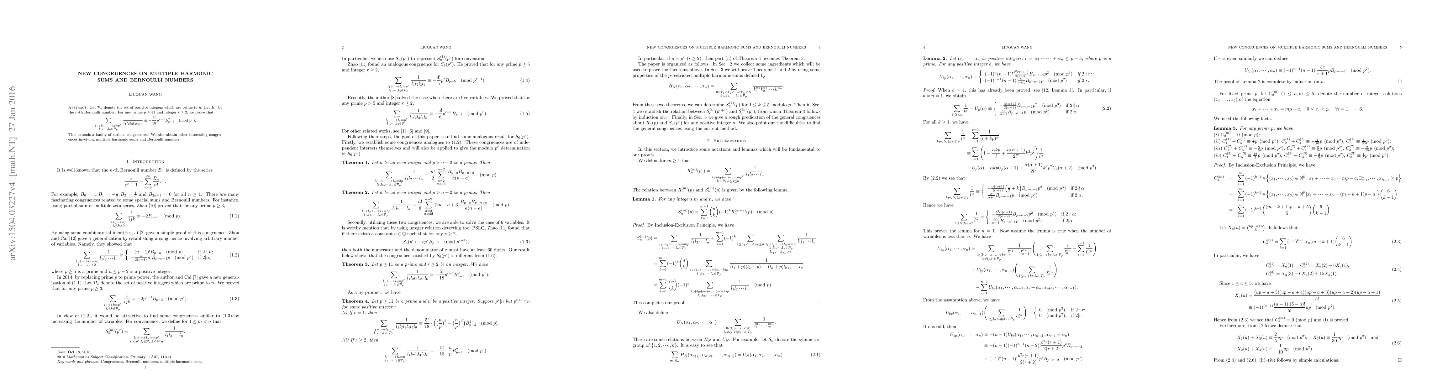 Let ${\mathcal{P}_{n}}$ denote the set of positive integers which are prime to $n$. Let $B_{n}$ be the $n$-th Bernoulli number. For any prime $p \ge 11$ and integer $r\ge 2$, we prove that $$ \sum\limits_{\begin{smallmatrix} {{l}_{1}}+{{l}_{2}}+\cdots +{{l}_{6}}={{p}^{r}} {{l}_{1}},\cdots ,{{l}_{6}}\in {\mathcal{P}_{p}} \end{smallmatrix}}{\frac{1}{{{l}_{1}}{{l}_{2}}{{l}_{3}}{{l}_{4}}{{l}_{5}}{l}_{6}}}\equiv - \frac{{5!}}{18}p^{r-1}B_{p-3}^{2} \pmod{{{p}^{r}}}. $$ This extends a family of curious congruences. We also obtain other interesting congruences involving multiple harmonic sums and Bernoulli numbers.