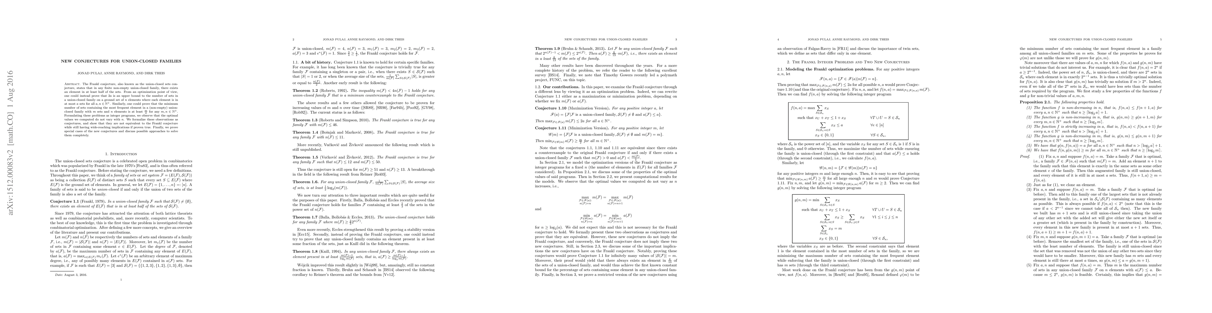 The Frankl conjecture, also known as the union-closed sets conjecture, states that in any finite non-empty union-closed family, there exists an element in at least half of the sets. From an optimization point of view, one could instead prove that $2a$ is an upper bound to the number of sets in a union-closed family on a ground set of $n$ elements where each element is in at most $a$ sets for all $a,n\in \mathbb{N}^+$. Similarly, one could prove that the minimum number of sets containing the most frequent element in a (non-empty) union-closed family with $m$ sets and $n$ elements is at least $\frac{m}{2}$ for any $m,n\in \mathbb{N}^+$. Formulating these problems as integer programs, we observe that the optimal values we computed do not vary with $n$. We formalize these observations as conjectures, and show that they are not equivalent to the Frankl conjecture while still having wide-reaching implications if proven true. Finally, we prove special cases of the new conjectures and discuss possible approaches to solve them completely.