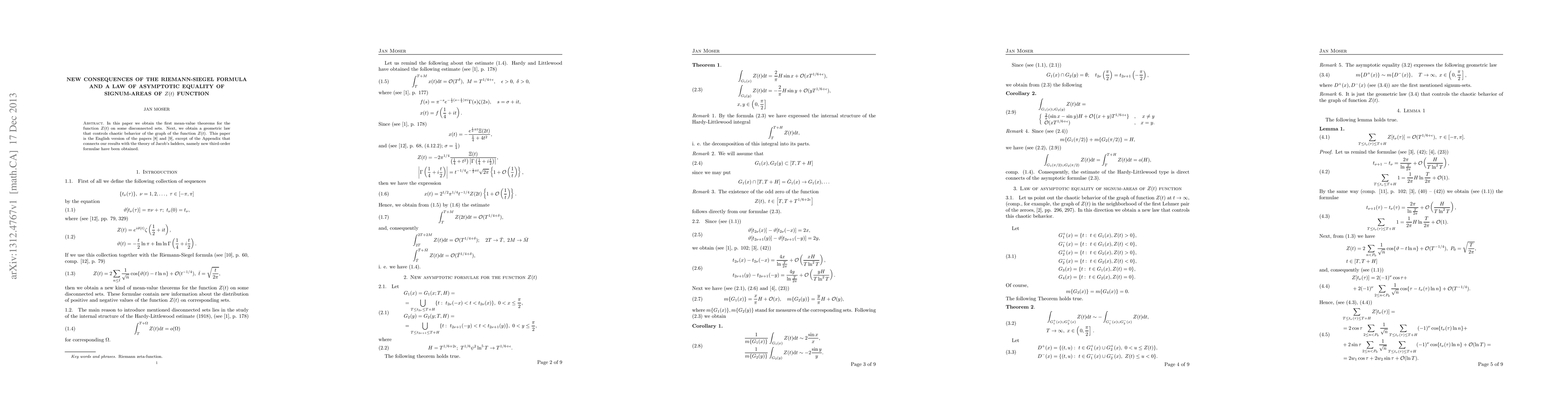 In this paper we obtain the first mean-value theorems for the function $Z(t)$ on some disconnected sets. Next, we obtain a geometric law that controls chaotic behavior of the graph of the function $Z(t)$. This paper is the English version of the papers \cite{8} and \cite{9}, except of the Appendix that connects our results with the theory of Jacob's ladders, namely new third-order formulae have been obtained.