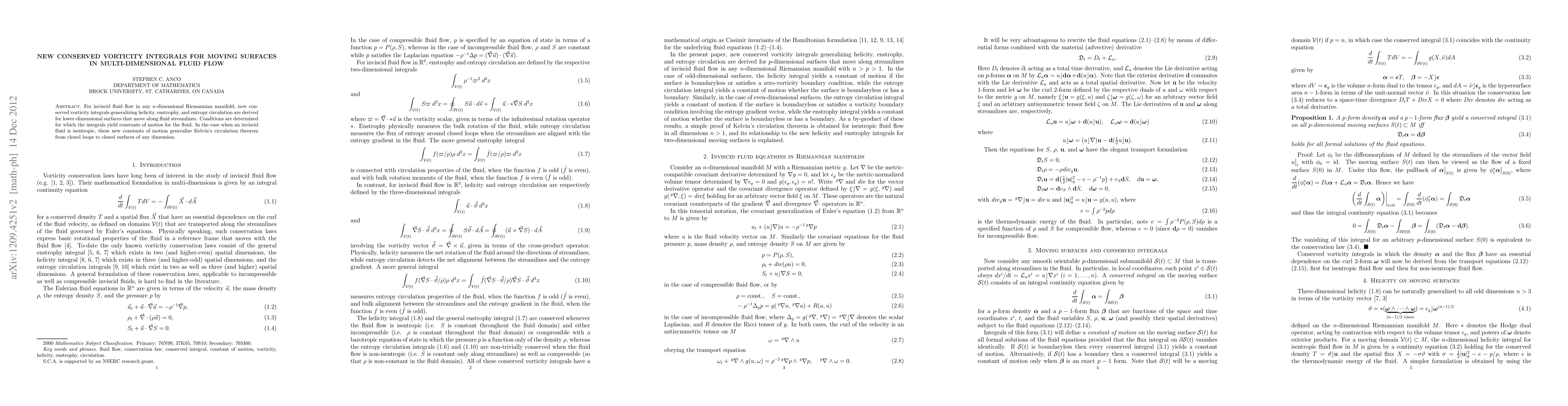 This paper derives new conserved vorticity integrals for moving surfaces in multi-dimensional fluid flow, generalizing concepts like helicity and enstrophy. These integrals yield constants of motion, extending Kelvin's circulation theorem to higher-dimensional surfaces in inviscid, isentropic fluids.
