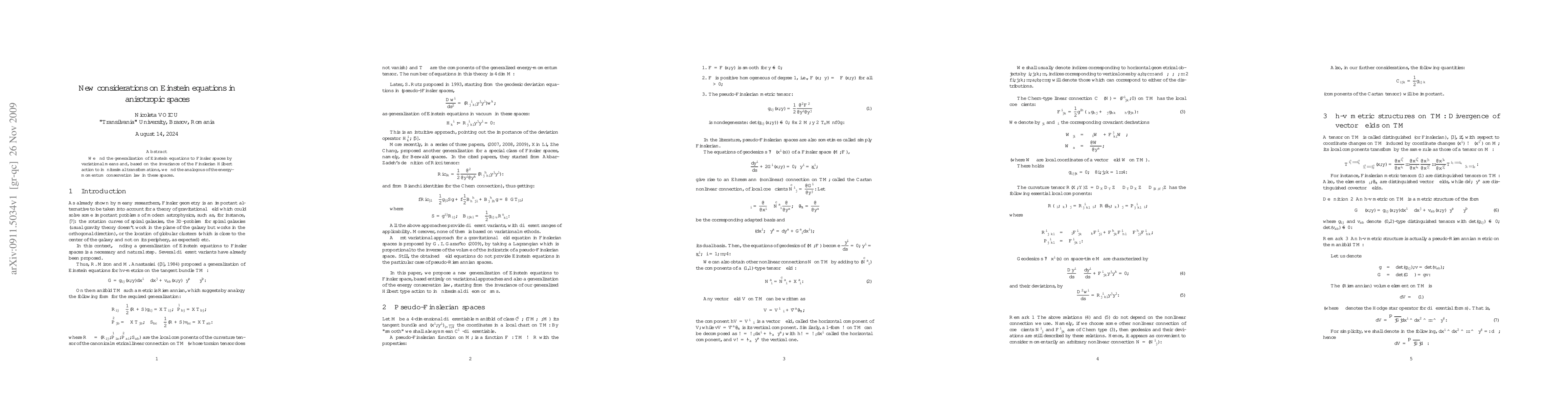 This paper generalizes Einstein's equations to Finsler spaces using variational methods and establishes an energy-momentum conservation law based on the invariance of the Finslerian Hilbert action under infinitesimal transformations.