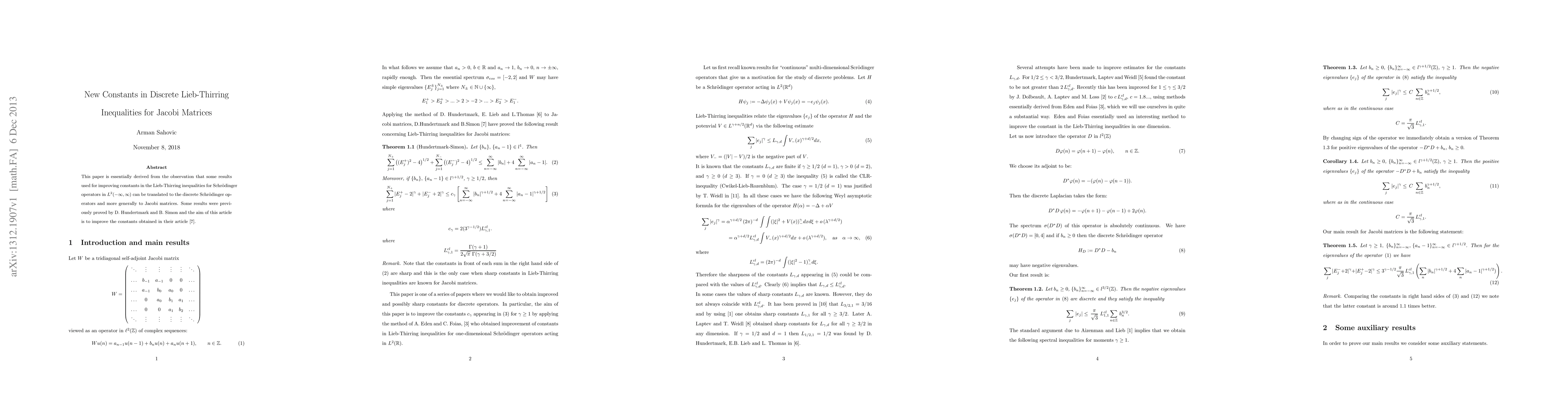 The paper presents new constants in discrete Lieb-Thirring inequalities for Jacobi matrices, improving upon previous results by Hundertmark and Simon.