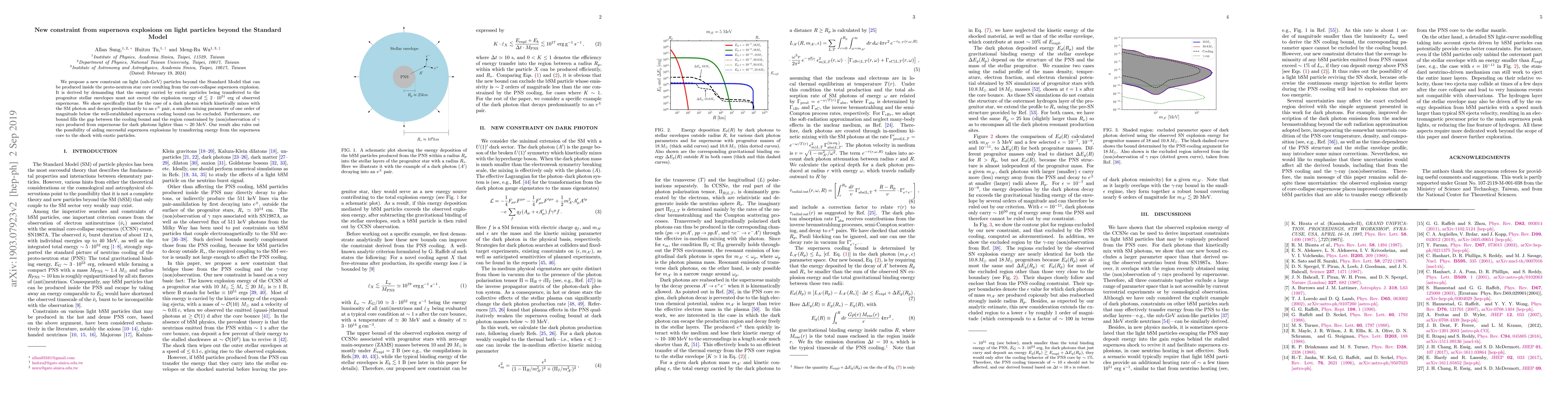 This paper proposes a new constraint on sub-GeV particles beyond the Standard Model, specifically dark photons, based on their production in proto-neutron stars during supernova explosions. The study shows that these particles cannot transfer energy that exceeds the observed explosion energy, thereby excluding a smaller mixing parameter for dark photons.