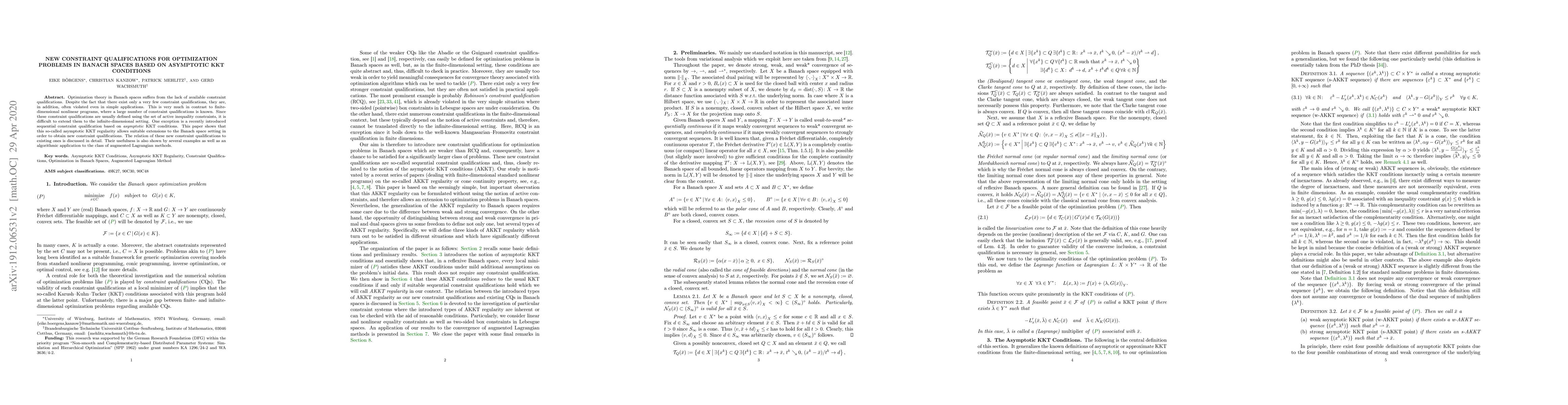 Optimization theory in Banach spaces suffers from the lack of available constraint qualifications. Despite the fact that there exist only a very few constraint qualifications, they are, in addition, often violated even in simple applications. This is very much in contrast to finite-dimensional nonlinear programs, where a large number of constraint qualifications is known. Since these constraint qualifications are usually defined using the set of active inequality constraints, it is difficult to extend them to the infinite-dimensional setting. One exception is a recently introduced sequential constraint qualification based on asymptotic KKT conditions. This paper shows that this so-called asymptotic KKT regularity allows suitable extensions to the Banach space setting in order to obtain new constraint qualifications. The relation of these new constraint qualifications to existing ones is discussed in detail. Their usefulness is also shown by several examples as well as an algorithmic application to the class of augmented Lagrangian methods.