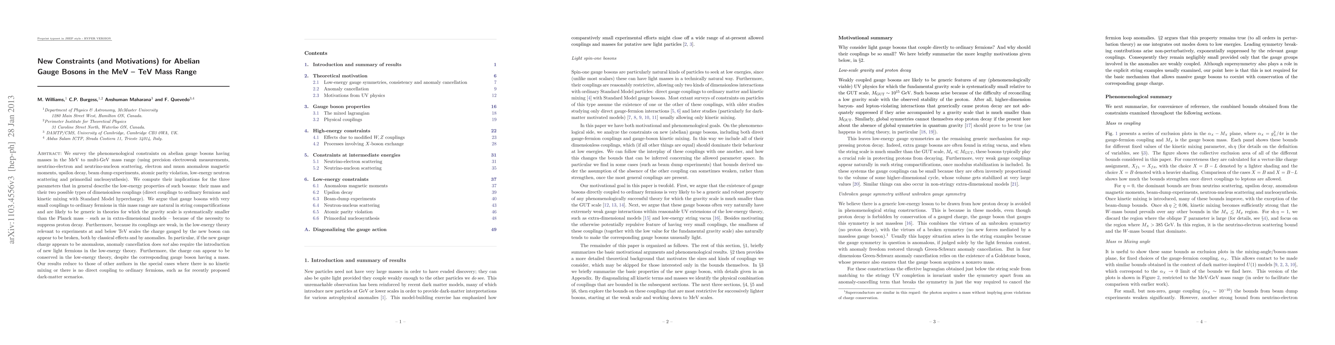 We survey the phenomenological constraints on abelian gauge bosons having masses in the MeV to multi-GeV mass range (using precision electroweak measurements, neutrino-electron and neutrino-nucleon scattering, electron and muon anomalous magnetic moments, upsilon decay, beam dump experiments, atomic parity violation, low-energy neutron scattering and primordial nucleosynthesis). We compute their implications for the three parameters that in general describe the low-energy properties of such bosons: their mass and their two possible types of dimensionless couplings (direct couplings to ordinary fermions and kinetic mixing with Standard Model hypercharge). We argue that gauge bosons with very small couplings to ordinary fermions in this mass range are natural in string compactifications and are likely to be generic in theories for which the gravity scale is systematically smaller than the Planck mass - such as in extra-dimensional models - because of the necessity to suppress proton decay. Furthermore, because its couplings are weak, in the low-energy theory relevant to experiments at and below TeV scales the charge gauged by the new boson can appear to be broken, both by classical effects and by anomalies. In particular, if the new gauge charge appears to be anomalous, anomaly cancellation does not also require the introduction of new light fermions in the low-energy theory. Furthermore, the charge can appear to be conserved in the low-energy theory, despite the corresponding gauge boson having a mass. Our results reduce to those of other authors in the special cases where there is no kinetic mixing or there is no direct coupling to ordinary fermions, such as for recently proposed dark-matter scenarios.