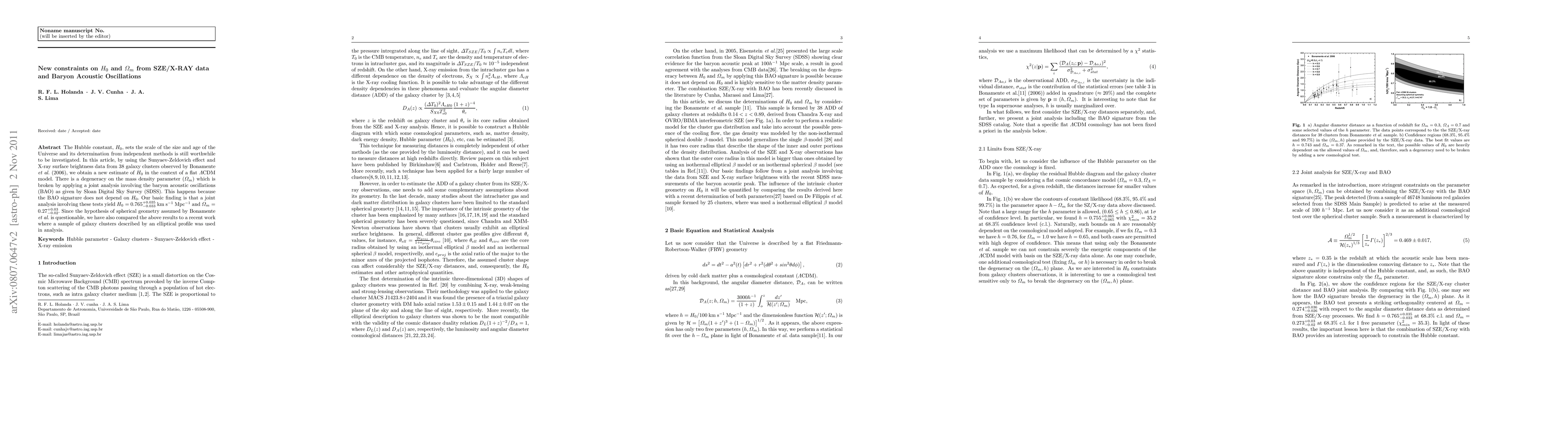 This paper provides a new estimate of the Hubble constant $H_0$ using the Sunyaev-Zel'dovich effect and X-ray data from galaxy clusters, combined with baryon acoustic oscillations (BAO). The joint analysis yields $H_0=0.765^{+0.035}_{-0.033}$ km s$^{-1}$ Mpc$^{-1}$ and $\Omega_{m}=0.27^{+0.03}_{-0.02}$, breaking the degeneracy on mass density parameter $\Omega_{m}$.