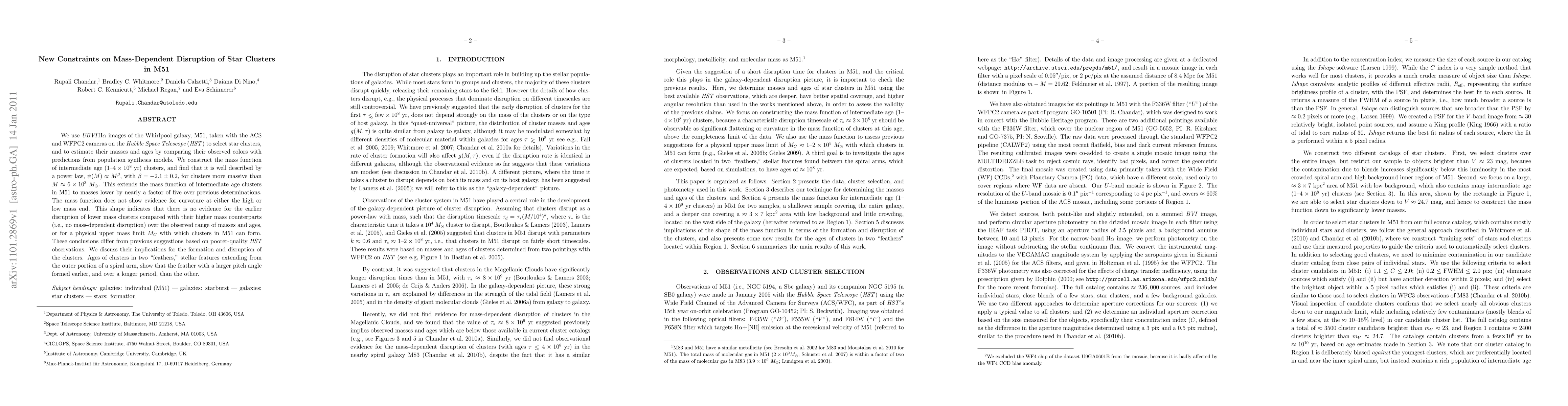 We use UBVI,Ha images of the Whirlpool galaxy, M51, taken with the ACS and WFPC2 cameras on the Hubble Space Telescope (HST) to select star clusters, and to estimate their masses and ages by comparing their observed colors with predictions from population synthesis models. We construct the mass function of intermediate age (1-4x10^8 yr) clusters, and find that it is well described by a power law, psi(M) propto M^beta, with beta=-2.1 +/- 0.2, for clusters more massive than approximately 6x10^3 Msun. This extends the mass function of intermediate age clusters in M51 to masses lower by nearly a factor of five over previous determinations. The mass function does not show evidence for curvature at either the high or low mass end. This shape indicates that there is no evidence for the earlier disruption of lower mass clusters compared with their higher mass counterparts (i.e., no mass-dependent disruption) over the observed range of masses and ages, or for a physical upper mass limit Mc with which clusters in M51 can form. These conclusions differ from previous suggestions based on poorer-quality HST observations. We discuss their implications for the formation and disruption of the clusters. Ages of clusters in two "feathers," stellar features extending from the outer portion of a spiral arm, show that the feather with a larger pitch angle formed earlier, and over a longer period, than the other.