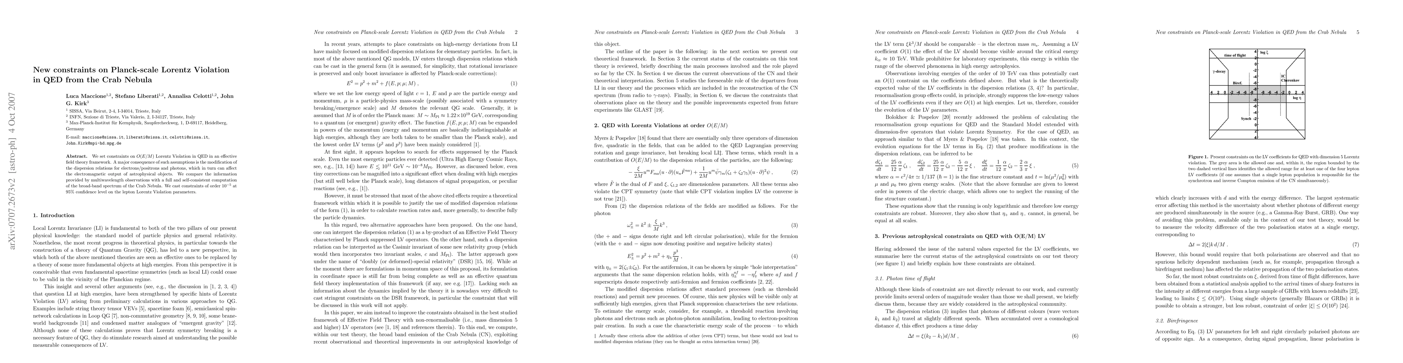 This paper sets new constraints on Planck-scale Lorentz violation in QED by analyzing the Crab Nebula's broad-band spectrum. It finds that modifications to dispersion relations due to such violations can be constrained to order 10^{-5} at 95% confidence level through multiwavelength observations.