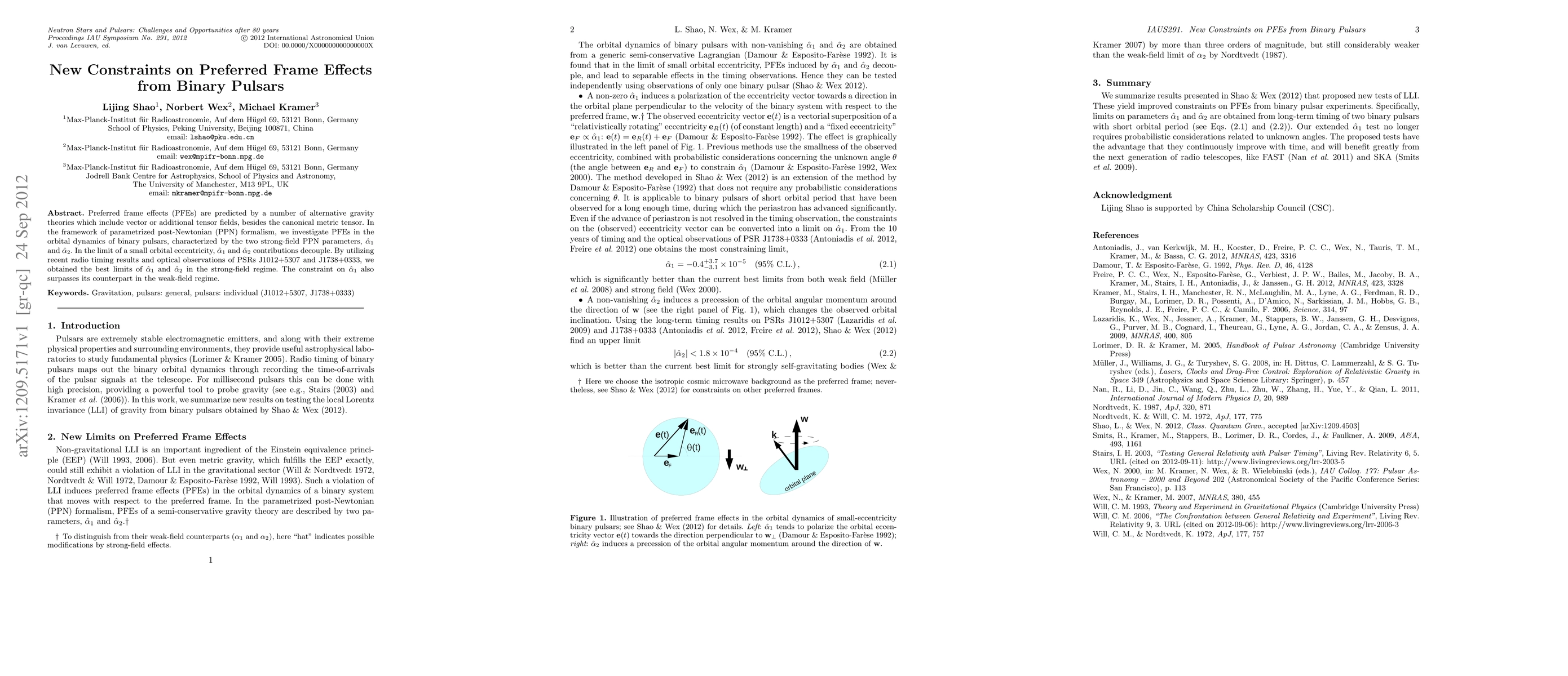 This paper investigates preferred frame effects (PFEs) in binary pulsars using the parametrized post-Newtonian formalism, obtaining the best limits for PFEs in the strong-field regime from observations of PSRs J1012+5307 and J1738+0333, surpassing previous weak-field constraints.