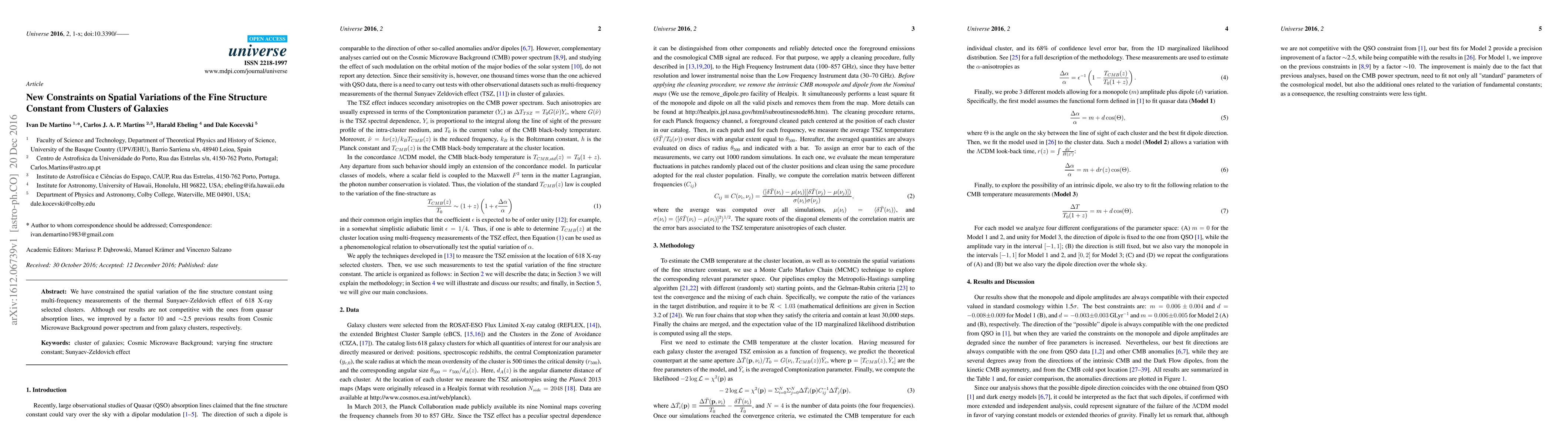 This study constrains spatial variations of the fine structure constant using thermal Sunyaev-Zeldovich effect measurements from 618 galaxy clusters, improving previous results by a factor of 10 and ~2.5, though not as effectively as quasar absorption lines.