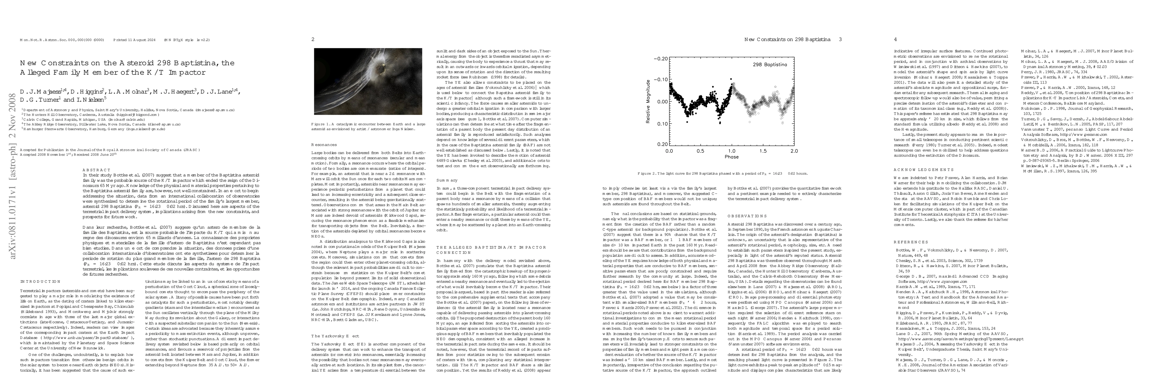 In their study Bottke et al. (2007) suggest that a member of the Baptistina asteroid family was the probable source of the K/T impactor which ended the reign of the Dinosaurs 65 Myr ago. Knowledge of the physical and material properties pertaining to the Baptistina asteroid family are, however, not well constrained. In an effort to begin addressing the situation, data from an international collaboration of observatories were synthesized to determine the rotational period of the family's largest member, asteroid 298 Baptistina (P_r = 16.23+-0.02 hrs). Discussed here are aspects of the terrestrial impact delivery system, implications arising from the new constraints, and prospects for future work.
