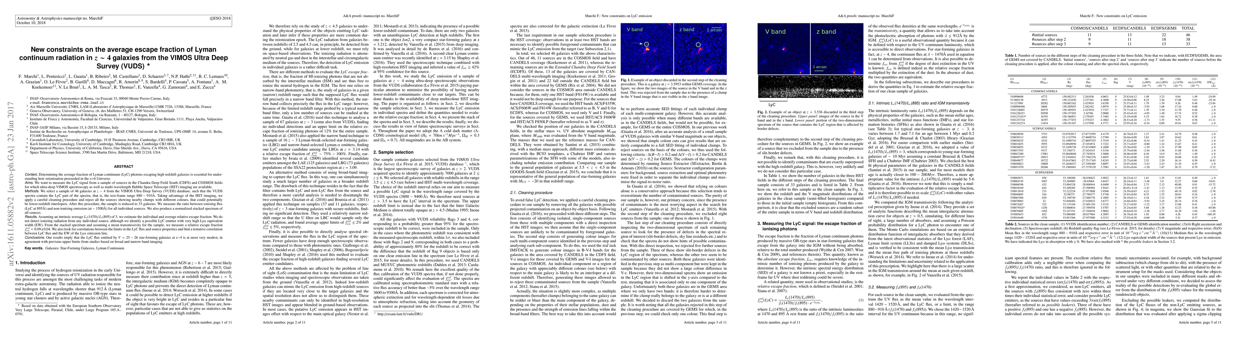 This study measures the average escape fraction of Lyman continuum (LyC) radiation from 46 z~4 galaxies using VIMOS Ultra Deep Survey (VUDS) data and HST imaging. After a careful selection and cleaning process, the analysis finds a relative escape fraction of $f_{esc}^{rel}=0.09\pm0.04$, indicating a modest LyC flux from star-forming galaxies at z~4, consistent with previous upper limits.