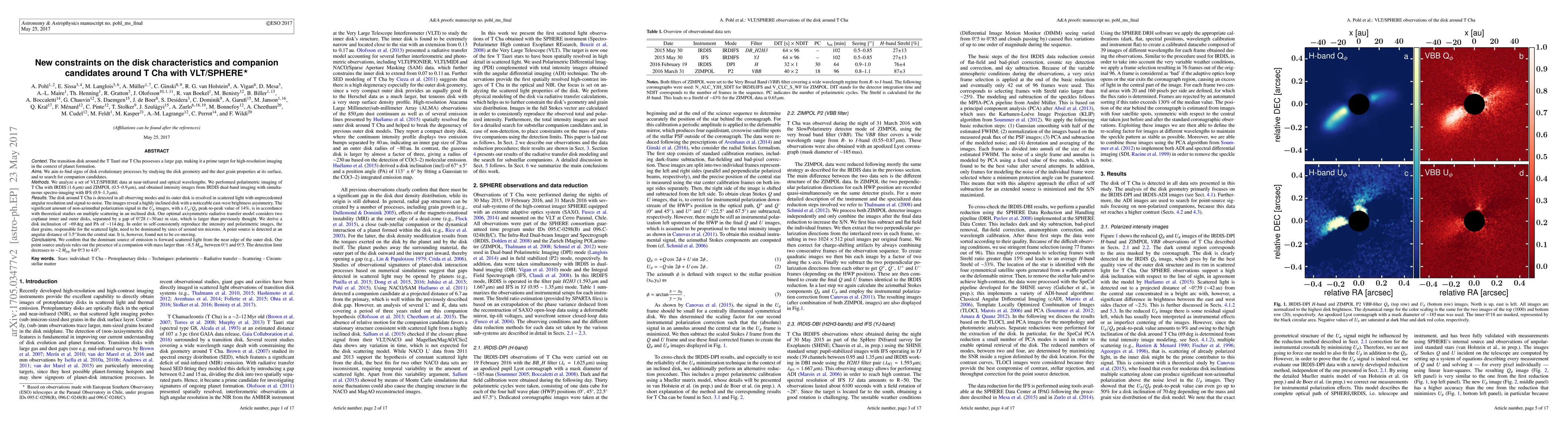 This study uses VLT/SPHERE data to analyze the transition disk around T Cha, revealing a highly inclined disk with a significant east-west brightness asymmetry and a gap of ~30au. The analysis rules out the presence of a massive companion within certain angular distances, while confirming the disk's dust grains are around ten microns in size.