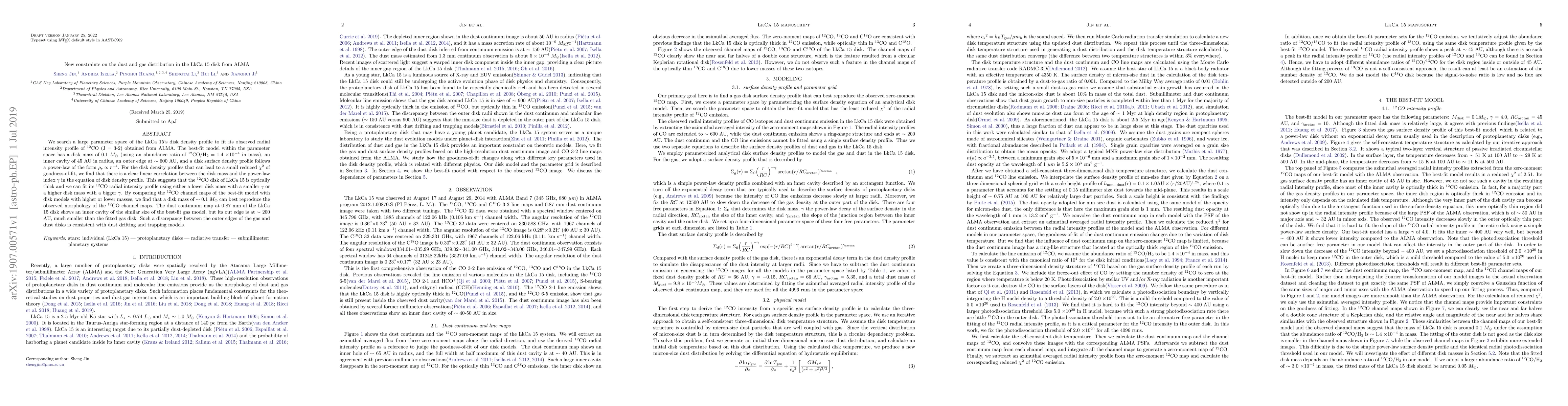 We search a large parameter space of the LkCa 15's disk density profile to fit its observed radial intensity profile of $^{12}$CO (J = 3-2) obtained from ALMA. The best-fit model within the parameter space has a disk mass of 0.1 $M_{\odot}$ (using an abundance ratio of $^{12}$CO/H$_2$ $=$ 1.4 $\times 10^{-4}$ in mass), an inner cavity of 45 AU in radius, an outer edge at $\sim$ 600 AU, and a disk surface density profile follows a power-law of the form $\rho_r \propto r^{-4}$. For the disk density profiles that can lead to a small reduced $\chi^2$ of goodness-of-fit, we find that there is a clear linear correlation between the disk mass and the power-law index $\gamma$ in the equation of disk density profile. This suggests that the $^{12}$CO disk of LkCa 15 is optically thick and we can fit its $^{12}$CO radial intensity profile using either a lower disk mass with a smaller $\gamma$ or a higher disk mass with a bigger $\gamma$. By comparing the $^{12}$CO channel maps of the best-fit model with disk models with higher or lower masses, we find that a disk mass of $\sim$ 0.1 $M_{\odot}$ can best reproduce the observed morphology of the $^{12}$CO channel maps. The dust continuum map at 0.87 mm of the LkCa 15 disk shows an inner cavity of the similar size of the best-fit gas model, but its out edge is at $\sim$ 200 AU, much smaller than the fitted gas disk. Such a discrepancy between the outer edges of the gas and dust disks is consistent with dust drifting and trapping models.