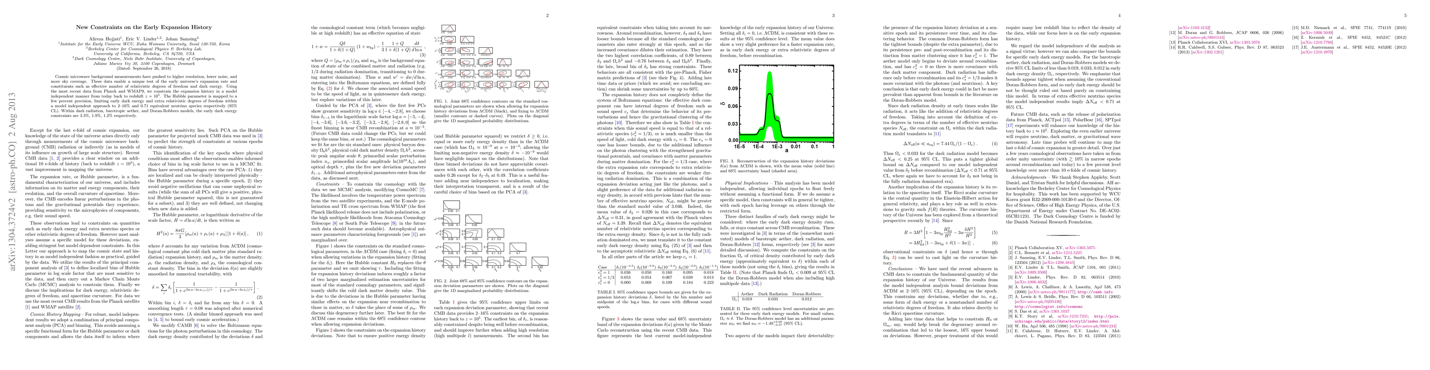 Cosmic microwave background measurements have pushed to higher resolution, lower noise, and more sky coverage. These data enable a unique test of the early universe's expansion rate and constituents such as effective number of relativistic degrees of freedom and dark energy. Using the most recent data from Planck and WMAP9, we constrain the expansion history in a model independent manner from today back to redshift z=10^5. The Hubble parameter is mapped to a few percent precision, limiting early dark energy and extra relativistic degrees of freedom within a model independent approach to 2-16% and 0.71 equivalent neutrino species respectively (95% CL). Within dark radiation, barotropic aether, and Doran-Robbers models, the early dark energy constraints are 3.3%, 1.9%, 1.2% respectively.