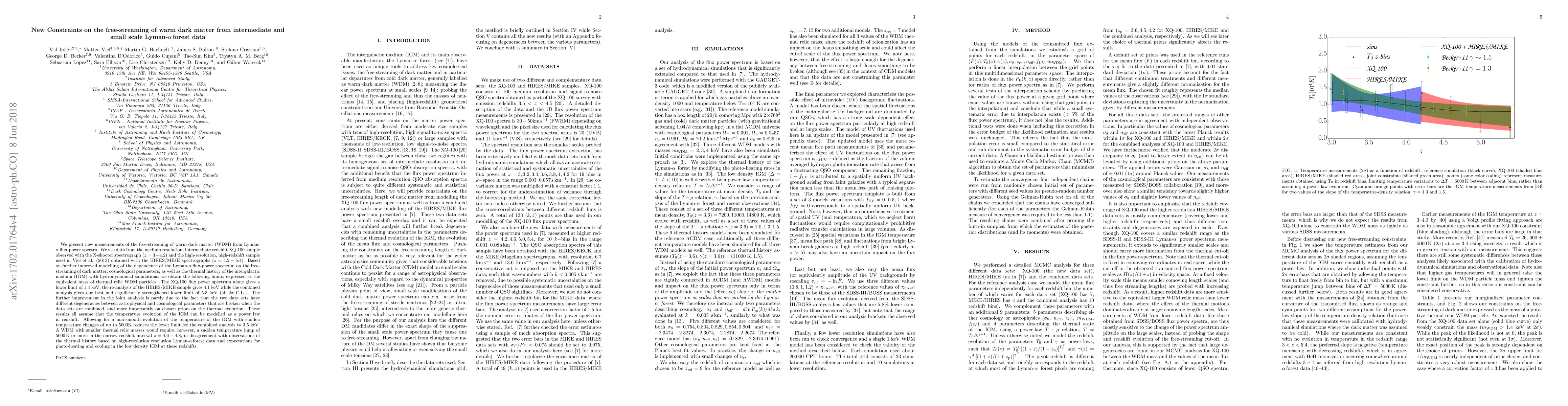 We present new measurements of the free-streaming of warm dark matter (WDM) from Lyman-$\alpha$ flux-power spectra. We use data from the medium resolution, intermediate redshift XQ-100 sample observed with the X-shooter spectrograph ($z=3 - 4.2$) and the high-resolution, high-redshift sample used in Viel et al. (2013) obtained with the HIRES/MIKE spectrographs ($z=4.2 - 5.4$). Based on further improved modelling of the dependence of the Lyman-$\alpha$ flux-power spectrum on the free-streaming of dark matter, cosmological parameters, as well as the thermal history of the intergalactic medium (IGM) with hydrodynamical simulations, we obtain the following limits, expressed as the equivalent mass of thermal relic WDM particles. The XQ-100 flux power spectrum alone gives a lower limit of 1.4 keV, the re-analysis of the HIRES/MIKE sample gives 4.1 keV while the combined analysis gives our best and significantly strengthened lower limit of 5.3 keV (all 2$\sigma$ C.L.). The further improvement in the joint analysis is partly due to the fact that the two data sets have different degeneracies between astrophysical and cosmological parameters that are broken when the data sets are combined, and more importantly on chosen priors on the thermal evolution. These results all assume that the temperature evolution of the IGM can be modelled as a power law in redshift. Allowing for a non-smooth evolution of the temperature of the IGM with sudden temperature changes of up to 5000K reduces the lower limit for the combined analysis to 3.5 keV. A WDM with smaller thermal relic masses would require, however, a sudden temperature jump of $5000\,K$ or more in the narrow redshift interval $z=4.6-4.8$, in disagreement with observations of the thermal history based on high-resolution resolution Lyman-$\alpha$ forest data and expectations for photo-heating and cooling in the low density IGM at these redshifts.