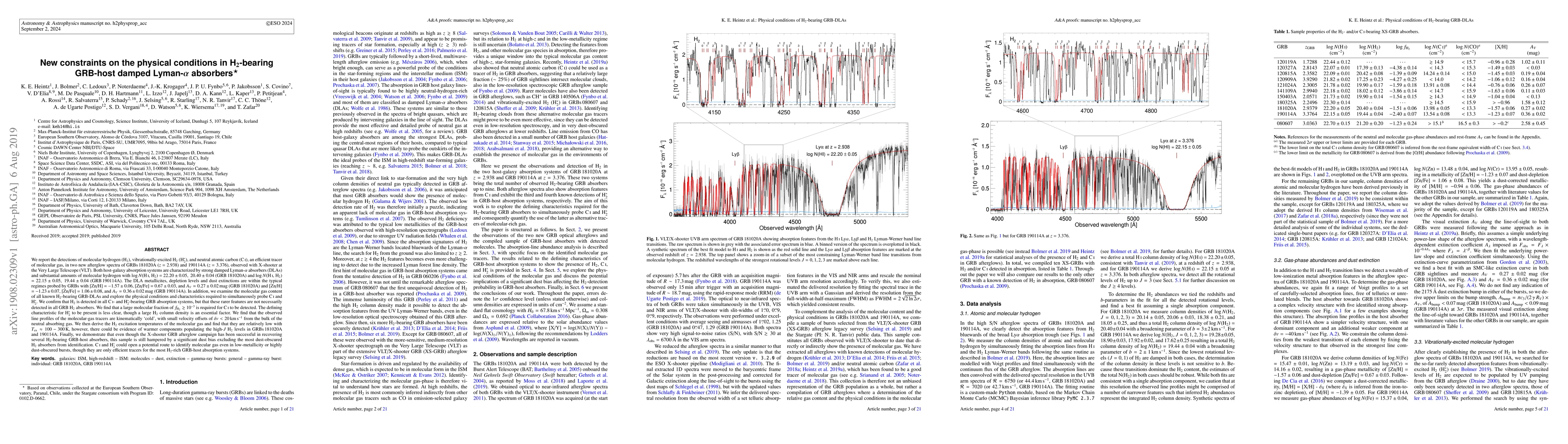We report the detections of molecular hydrogen (H$_2$), vibrationally-excited H$_2$ (H$^*_2$), and neutral atomic carbon (CI), in two new afterglow spectra of GRBs\,181020A ($z=2.938$) and 190114A ($z=3.376$), observed with X-shooter at the Very Large Telescope (VLT). Both host-galaxy absorption systems are characterized by strong damped Lyman-$\alpha$ absorbers (DLAs) and substantial amounts of molecular hydrogen with $\log N$(HI, H$_2$) = $22.20\pm 0.05,~20.40\pm 0.04$ (GRB\,181020A) and $\log N$(HI, H$_2$) = $22.15\pm 0.05,~19.44\pm 0.04$ (GRB\,190114A). The DLA metallicites, depletion levels and dust extinctions are [Zn/H] = $-1.57\pm 0.06$, [Zn/Fe] = $0.67\pm 0.03$, and $A_V = 0.27\pm 0.02$\,mag (GRB\,181020A) and [Zn/H] = $-1.23\pm 0.07$, [Zn/Fe] = $1.06\pm 0.08$, and $A_V = 0.36\pm 0.02$\,mag (GRB\,190114A). We then examine the molecular gas content of all known H$_2$-bearing GRB-DLAs and explore the physical conditions and characteristics of these systems. We confirm that H$_2$ is detected in all CI- and H$^*_2$-bearing GRB absorption systems, but that these rarer features are not necessarily detected in all GRB H$_2$ absorbers. We find that a large molecular fraction of $f_{\rm H_2} \gtrsim 10^{-3}$ is required for CI to be detected. The defining characteristic for H$^*_2$ to be present is less clear, though a large H$_2$ column density is an essential factor. We then derive the H$_2$ excitation temperatures of the molecular gas and find that they are relatively low with $T_{\rm ex} \approx 100 - 300$\,K, however, there could be evidence of warmer components populating the high-$J$ H$_2$ levels in GRBs\,181020A and 190114A. Finally, we demonstrate that the otherwise successful X-shooter GRB afterglow campaign is hampered by a significant dust bias excluding the most dust-obscured H$_2$ absorbers from identification [Abridged].