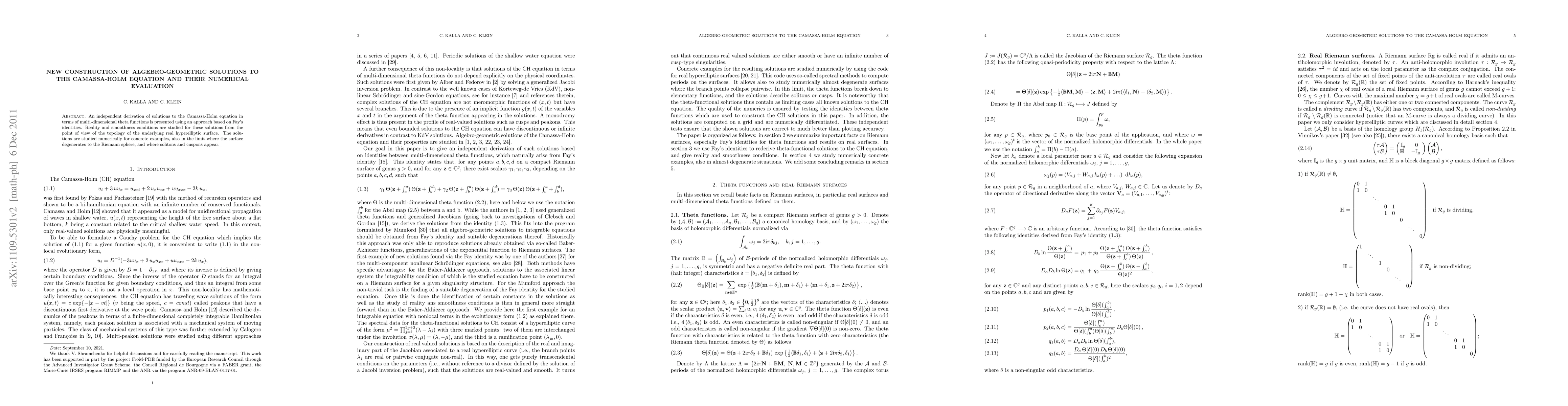 An independent derivation of solutions to the Camassa-Holm equation in terms of multi-dimensional theta functions is presented using an approach based on Fay's identities. Reality and smoothness conditions are studied for these solutions from the point of view of the topology of the underlying real hyperelliptic surface. The solutions are studied numerically for concrete examples, also in the limit where the surface degenerates to the Riemann sphere, and where solitons and cuspons appear.