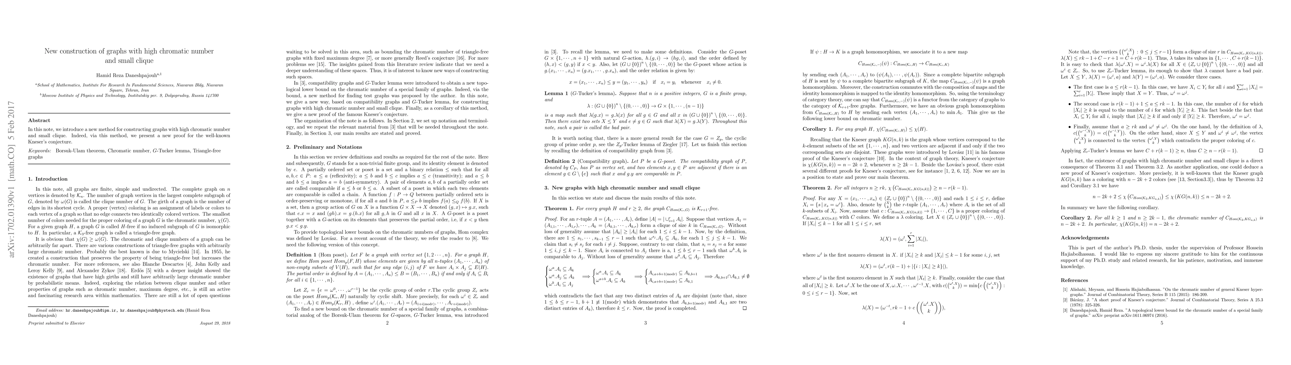 Summary: This paper presents a novel construction method for graphs with high chromatic numbers and small cliques, providing a new proof for Kneser's conjecture. The method's effectiveness is demonstrated through the resolution of a longstanding problem in graph theory.