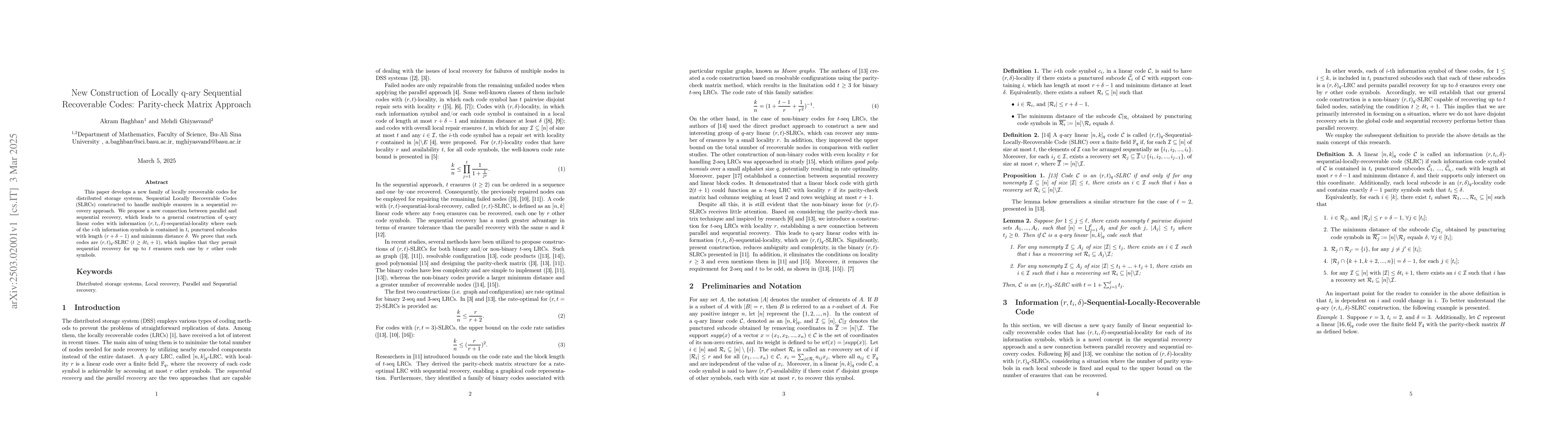 The paper proposes a new construction of q-ary linear codes using a parity-check matrix approach for Sequential Locally Recoverable Codes (SLRCs), enabling sequential recovery from multiple erasures.