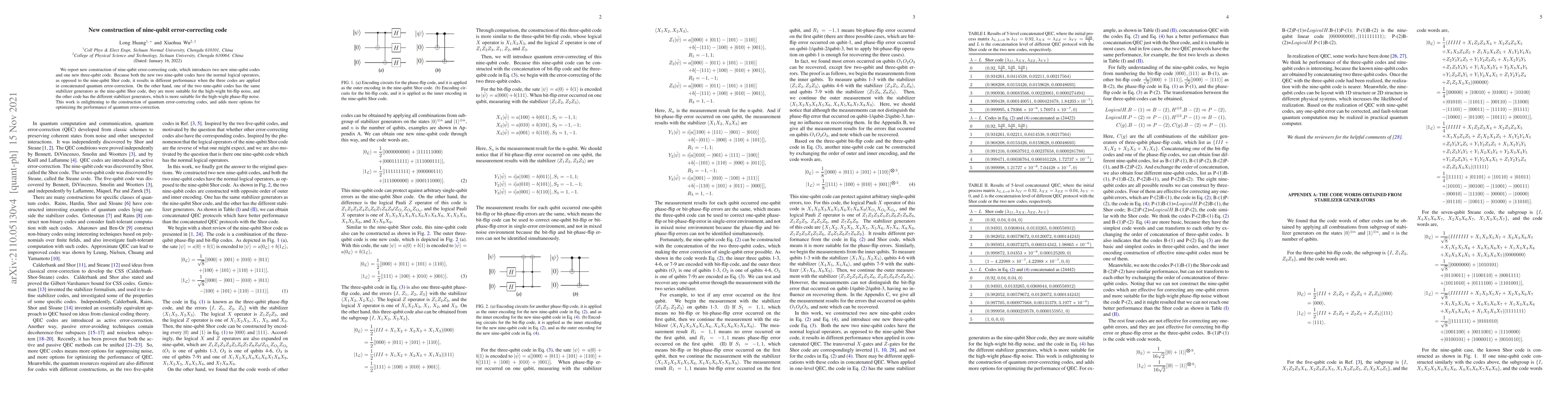 We report new construction of nine-qubit error-correcting code, which introduces two new nine-qubit codes and one new three-qubit code. Because both the new two nine-qubit codes have the normal logical operators, as opposed to the nine-qubit Shor code, it results in different performance when the three codes are applied in concatenated quantum error-correction. On the other hand, one of the two nine-qubit codes has the same stabilizer generators as the nine-qubit Shor code, they are more suitable for the high-wight bit-flip noise, and the other code has the different stabilizer generators, which is more suitable for the high-wight phase-flip noise. This work is enlightening to the construction of quantum error-correcting codes, and adds more options for optimizing the performance of quantum error-correction.
