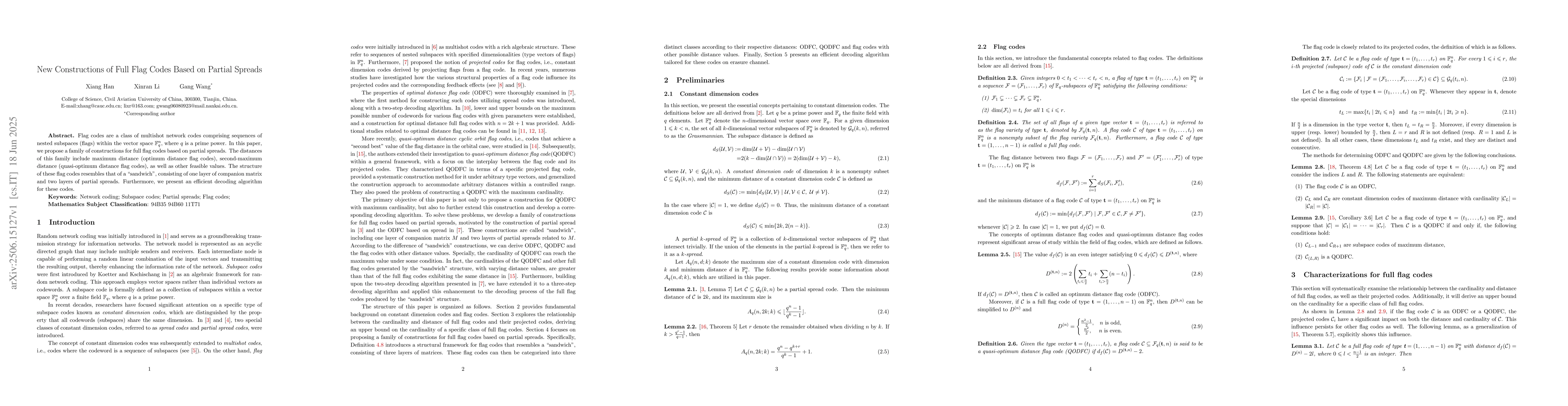 Flag codes are a class of multishot network codes comprising sequences of nested subspaces (flags) within the vector space $\mathbb{F}_q^n$, where $q$ is a prime power. In this paper, we propose a family of constructions for full flag codes based on partial spreads. The distances of this family include maximum distance (optimum distance flag codes), second-maximum distance (quasi-optimum distance flag codes), as well as other feasible values. The structure of these flag codes resembles that of a \textquotedblleft sandwich", consisting of one layer of companion matrix and two layers of partial spreads. Furthermore, we present an efficient decoding algorithm for these codes.