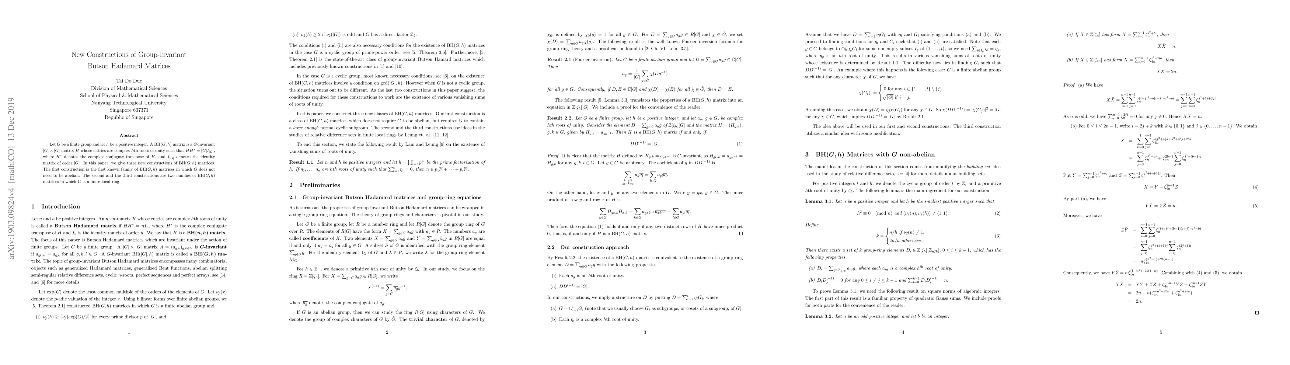 Let $G$ be a finite group and let $h$ be a positive integer. A $\text{BH}(G,h)$ matrix is a $G$-invariant $|G|\times |G|$ matrix $H$ whose entries are complex $h$th roots of unity such that $HH^*=|G|I_{|G|}$, where $H^*$ denotes the complex conjugate transpose of $H$, and $I_{|G|}$ is the identity matrix of order $|G|$. In this paper, we give three new constructions of $\text{BH}(G,h)$ matrices. The first construction is the first known family of $\text{BH}(G,h)$ matrices in which $G$ does not need to be abelian. The second and the third constructions are two families of $\text{BH}(G,h)$ matrices in which $G$ is a finite local ring.