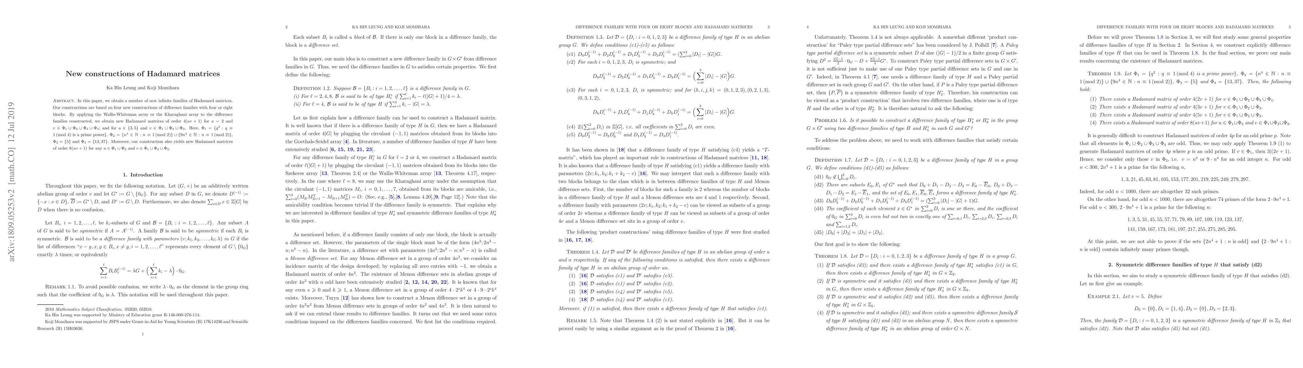 This paper presents new infinite families of Hadamard matrices derived from four novel constructions of difference families, leading to matrices of orders $4(uv+1)$ and $8(uv+1)$ for specific values of $u$ and $v$ within defined sets. The constructions utilize the Wallis-Whiteman array and the Kharaghani array.