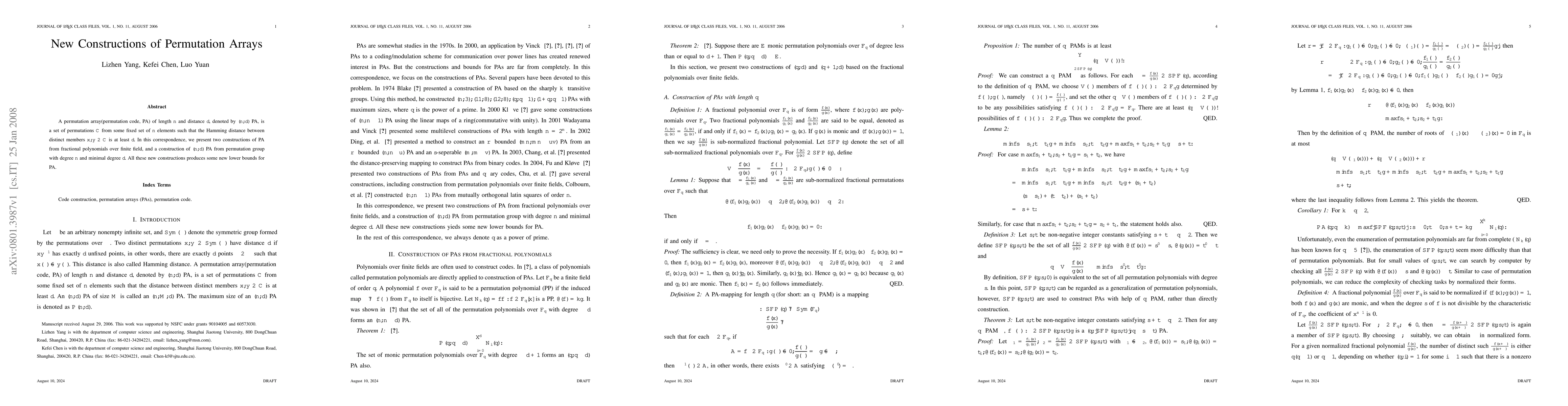 A permutation array(permutation code, PA) of length $n$ and distance $d$, denoted by $(n,d)$ PA, is a set of permutations $C$ from some fixed set of $n$ elements such that the Hamming distance between distinct members $\mathbf{x},\mathbf{y}\in C$ is at least $d$. In this correspondence, we present two constructions of PA from fractional polynomials over finite field, and a construction of $(n,d)$ PA from permutation group with degree $n$ and minimal degree $d$. All these new constructions produces some new lower bounds for PA.