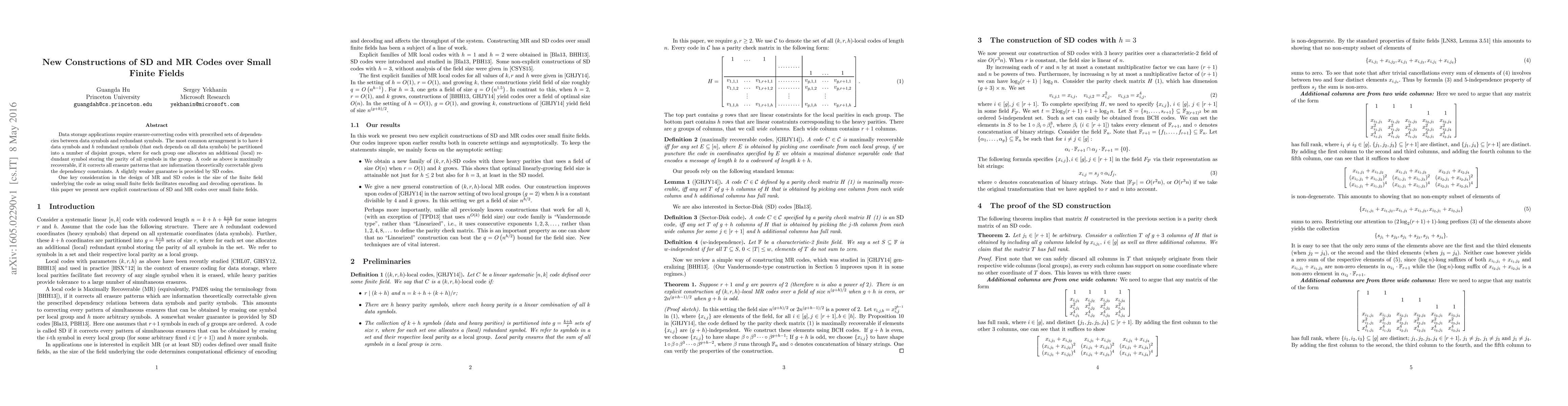 Data storage applications require erasure-correcting codes with prescribed sets of dependencies between data symbols and redundant symbols. The most common arrangement is to have $k$ data symbols and $h$ redundant symbols (that each depends on all data symbols) be partitioned into a number of disjoint groups, where for each group one allocates an additional (local) redundant symbol storing the parity of all symbols in the group. A code as above is maximally recoverable, if it corrects all erasure patterns that are information theoretically correctable given the dependency constraints. A slightly weaker guarantee is provided by SD codes. One key consideration in the design of MR and SD codes is the size of the finite field underlying the code as using small finite fields facilitates encoding and decoding operations. In this paper we present new explicit constructions of SD and MR codes over small finite fields.