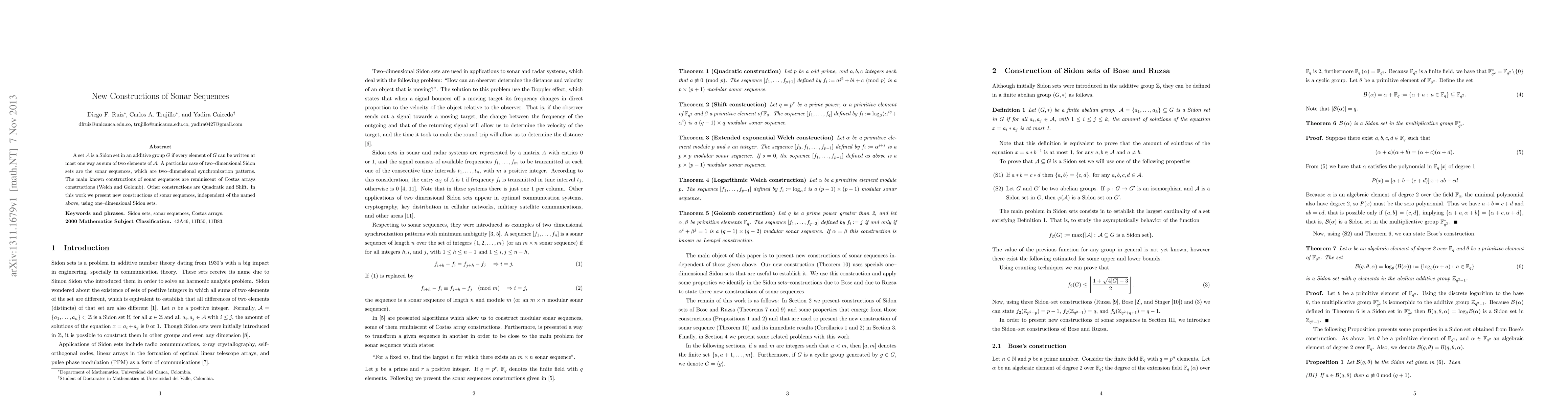 A set A is a Sidon set in an additive group G if every element of G can be written at most one way as sum of two elements of A. A particular case of two-dimensional Sidon sets are the sonar sequences, which are two-dimensional synchronization patterns. The main known constructions of sonar sequences are reminiscent of Costas arrays constructions (Welch and Golomb). Other constructions are Quadratic and Shift. In this work we present new constructions of sonar sequences, independent of the named above, using one-dimensional Sidon sets.