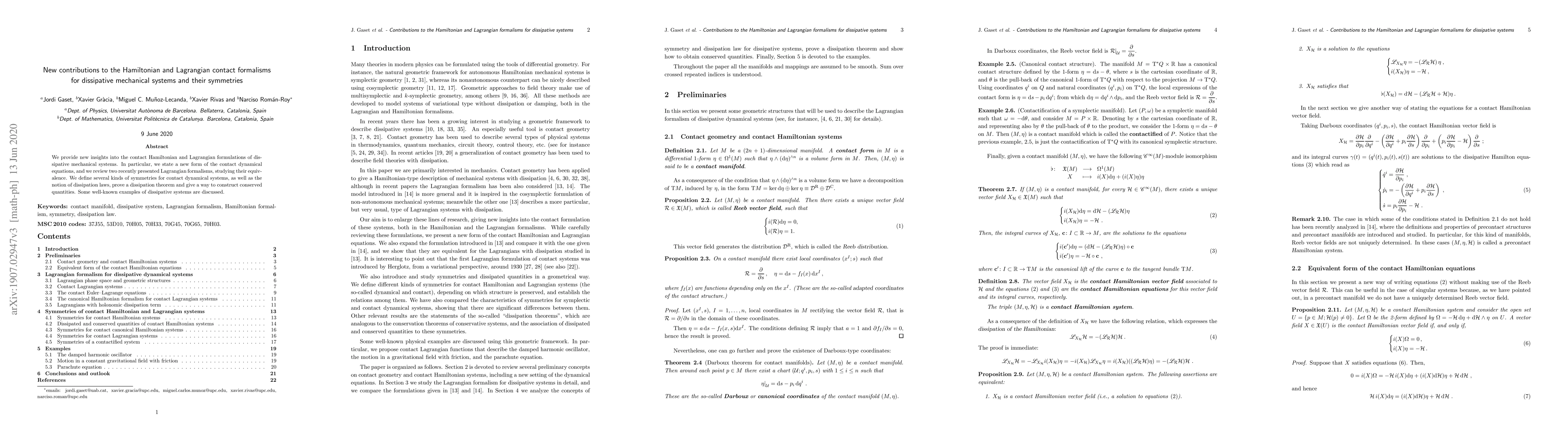 This paper introduces new forms of Hamiltonian and Lagrangian contact formulations for dissipative mechanical systems, discusses the equivalence of recent Lagrangian approaches, defines various symmetries and dissipation laws, proves a dissipation theorem, and outlines a method to construct conserved quantities. Examples of well-known dissipative systems are also examined.