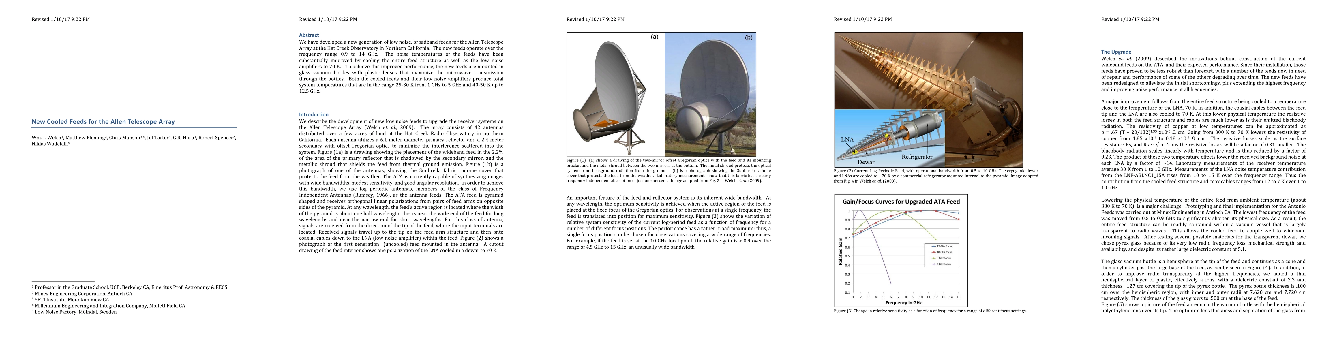 The research introduces a new generation of low noise, broadband feeds for the Allen Telescope Array, operating from 0.9 to 14 GHz, with significant noise temperature improvements achieved by cooling the feed structure and amplifiers to 70 K. The new design features glass vacuum bottles and plastic lenses to maximize microwave transmission.