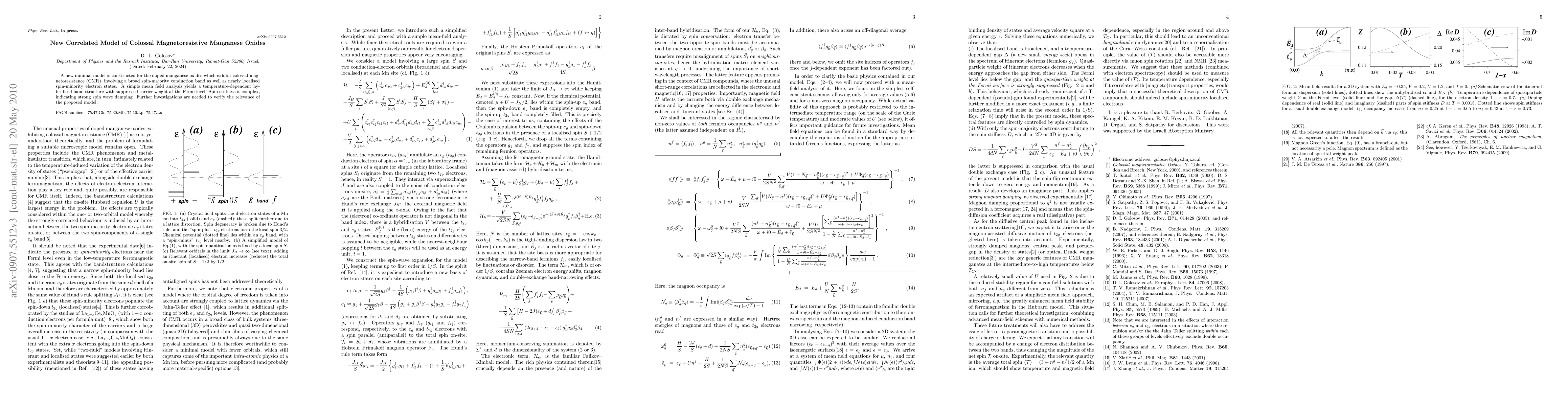 This paper proposes a new minimal model for doped manganese oxides showing colossal magnetoresistance, featuring a hybridised band structure with suppressed carrier weight. The model suggests complex spin stiffness indicating strong spin wave damping, awaiting experimental and theoretical validation.