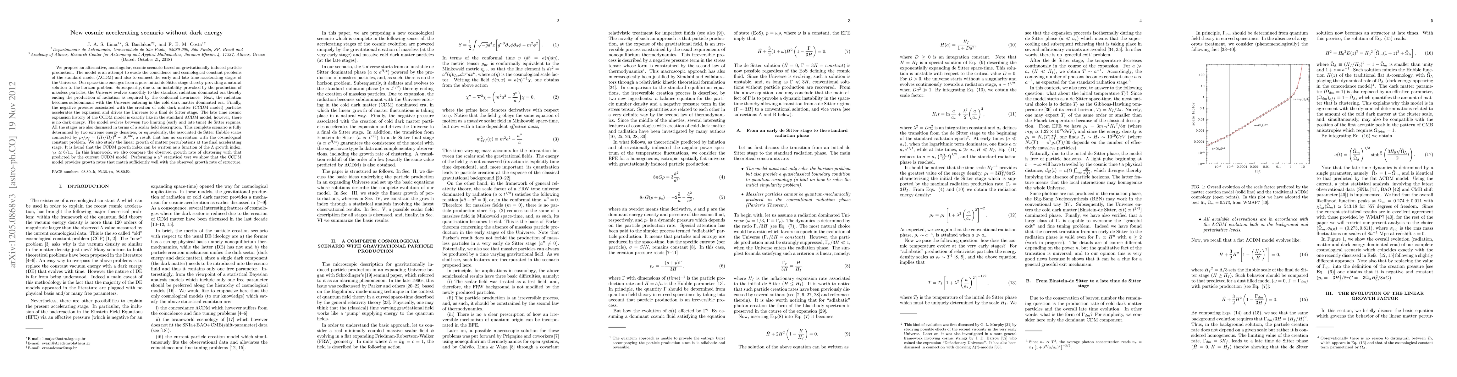 We propose an alternative, nonsingular, cosmic scenario based on gravitationally induced particle production. The model is an attempt to evade the coincidence and cosmological constant problems of the standard model ($\Lambda$CDM) and also to connect the early and late time accelerating stages of the Universe. Our space-time emerges from a pure initial de Sitter stage thereby providing a natural solution to the horizon problem. Subsequently, due to an instability provoked by the production of massless particles, the Universe evolves smoothly to the standard radiation dominated era thereby ending the production of radiation as required by the conformal invariance. Next, the radiation becomes sub-dominant with the Universe entering in the cold dark matter dominated era. Finally, the negative pressure associated with the creation of cold dark matter (CCDM model) particles accelerates the expansion and drives the Universe to a final de Sitter stage. The late time cosmic expansion history of the CCDM model is exactly like in the standard $\Lambda$CDM model, however, there is no dark energy. This complete scenario is fully determined by two extreme energy densities, or equivalently, the associated de Sitter Hubble scales connected by $\rho_I/\rho_f=(H_I/H_f)^{2} \sim 10^{122}$, a result that has no correlation with the cosmological constant problem. We also study the linear growth of matter perturbations at the final accelerating stage. It is found that the CCDM growth index can be written as a function of the $\Lambda$ growth index, $\gamma_{\Lambda} \simeq 6/11$. In this framework, we also compare the observed growth rate of clustering with that predicted by the current CCDM model. Performing a $\chi^{2}$ statistical test we show that the CCDM model provides growth rates that match sufficiently well with the observed growth rate of structure.