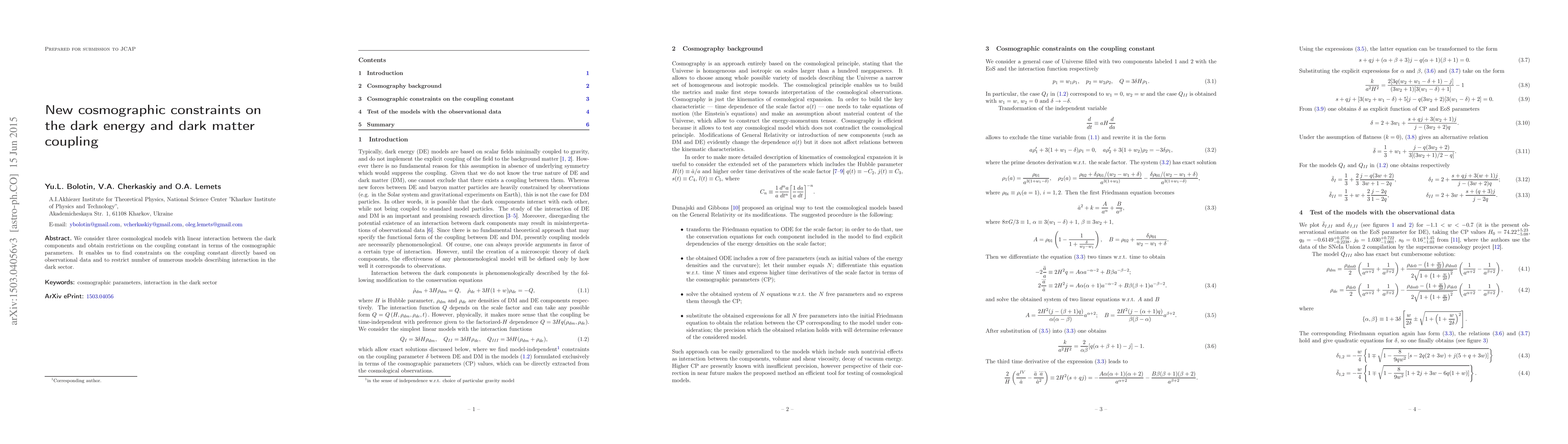 This paper investigates three cosmological models featuring linear interactions between dark energy and dark matter, deriving constraints on the coupling constant through cosmographic parameters. These constraints are derived directly from observational data, thereby narrowing down the range of possible models describing interactions in the dark sector.
