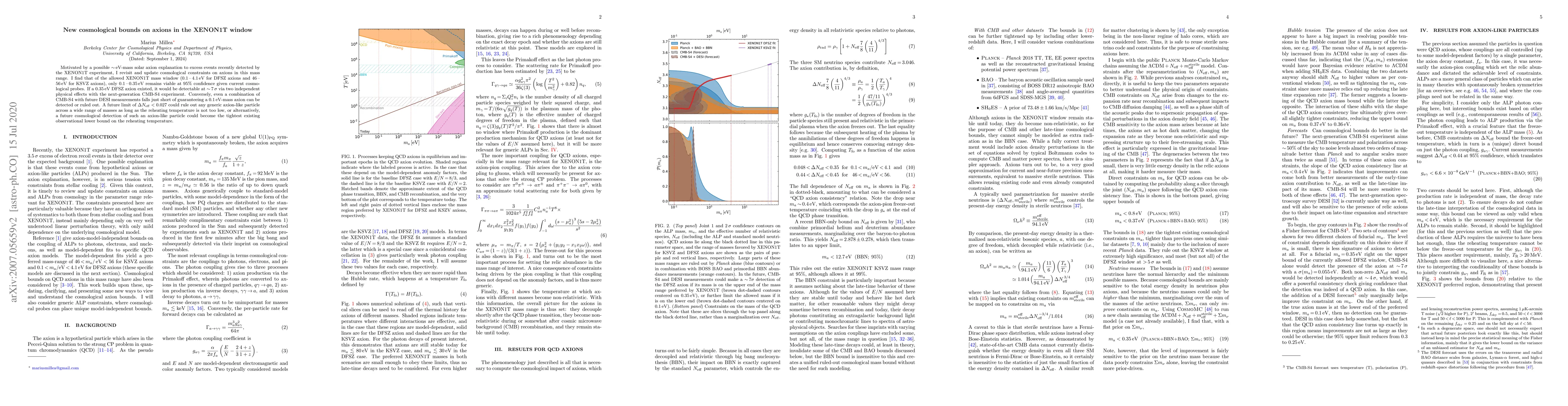 This paper updates cosmological constraints on axions, particularly within the mass range that could explain excess events in the XENON1T experiment. It concludes that only a small mass window (0.1 - 0.35 eV for DFSZ axions) remains viable given current cosmological data, while future experiments like CMB-S4 may detect or rule out these axions.