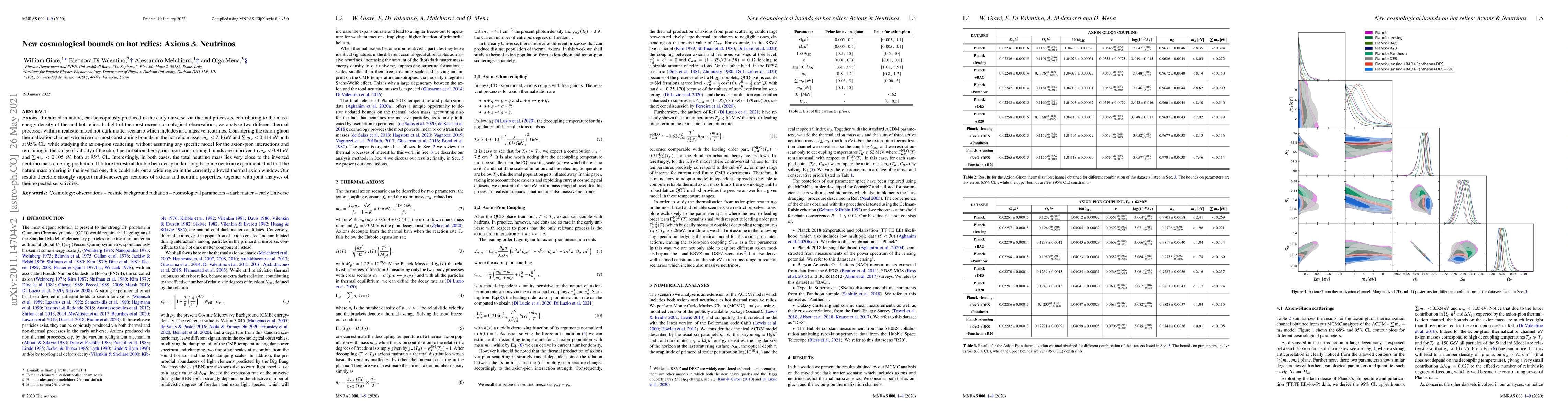 This paper derives new cosmological constraints on axions and neutrinos, showing that axion masses must be less than 0.91 eV and total neutrino mass must be less than 0.105 eV. The findings suggest a strong correlation between these particles and support multi-messenger searches.