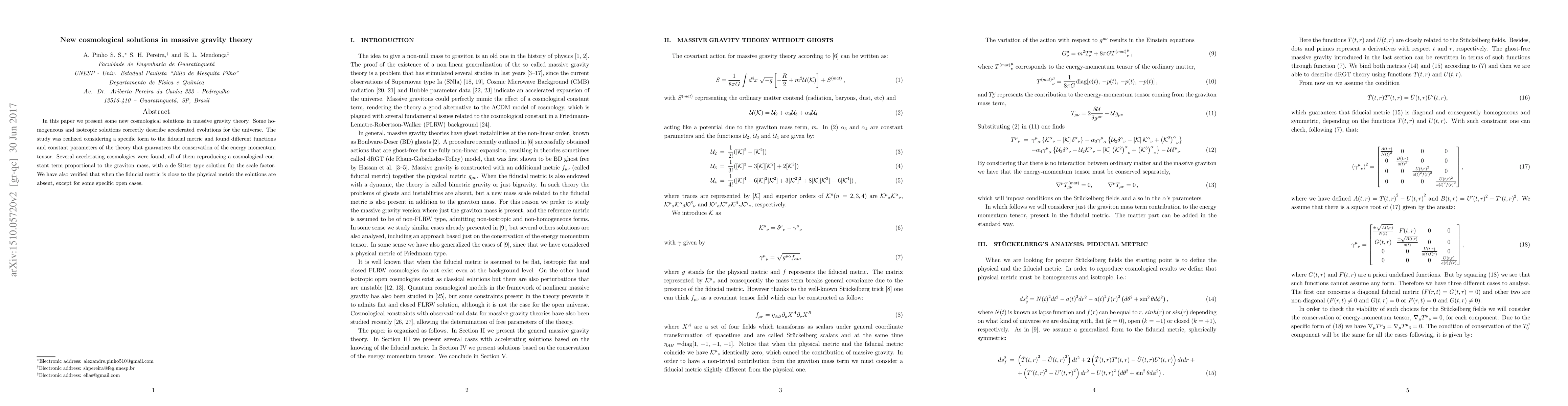 In this paper we present some new cosmological solutions in massive gravity theory. Some homogeneous and isotropic solutions correctly describe accelerated evolutions for the universe. The study was realized considering a specific form to the fiducial metric and found different functions and constant parameters of the theory that guarantees the conservation of the energy momentum tensor. Several accelerating cosmologies were found, all of them reproducing a cosmological constant term proportional to the graviton mass, with a de Sitter type solution for the scale factor. We have also verified that when the fiducial metric is close to the physical metric the solutions are absent, except for some specific open cases.