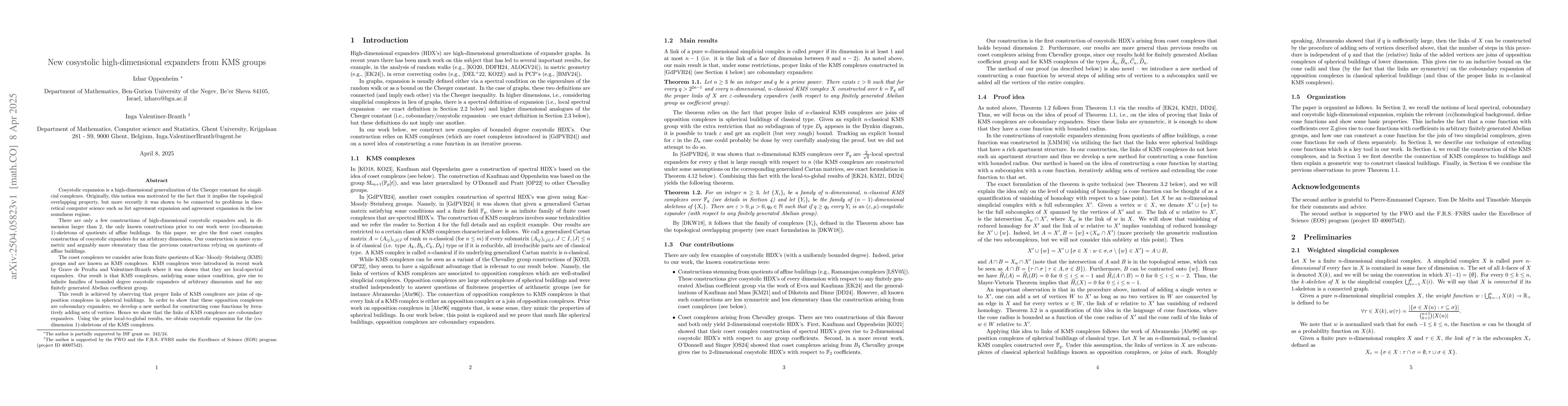 Researchers develop a new method to create high-dimensional cosystolic expanders from KMS groups, providing an infinite family of expanders with arbitrary dimension and any finitely generated Abelian coefficient group.