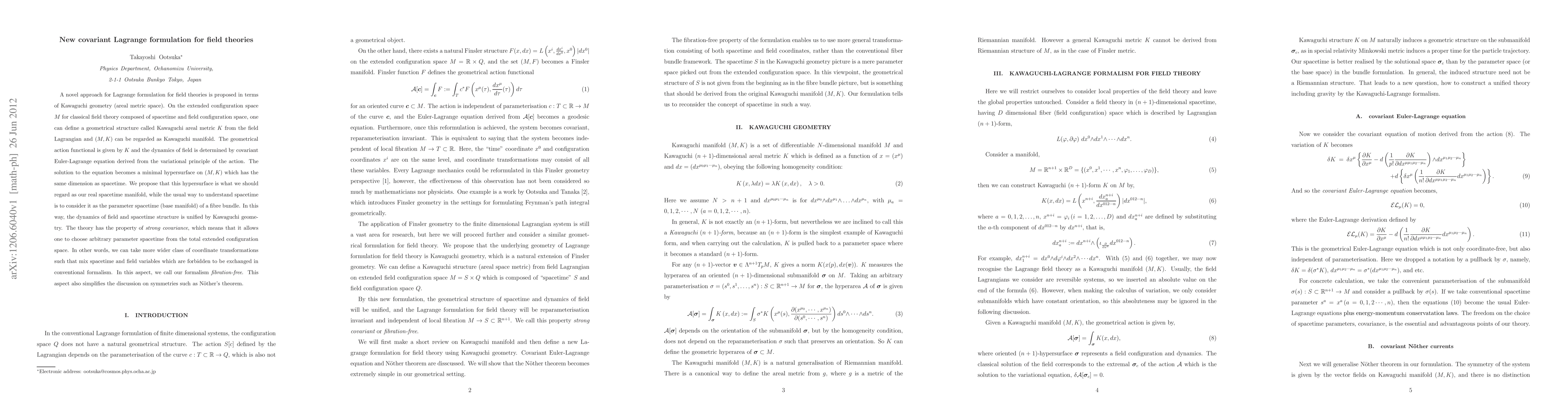 This paper proposes a novel covariant Lagrange formulation for field theories using Kawaguchi geometry, defining a geometrical structure called Kawaguchi areal metric K on the extended configuration space. The dynamics of fields are unified with spacetime structure through minimal hypersurfaces on this manifold, offering a fibration-free approach with strong covariance and simplified symmetry discussions.
